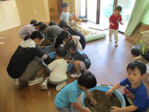 ということで、保育士が前日にじゃがいもを畑からタライへと移し、室内でじゃがいもの収穫ごっこをしました。