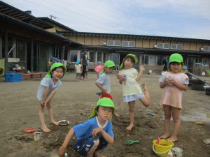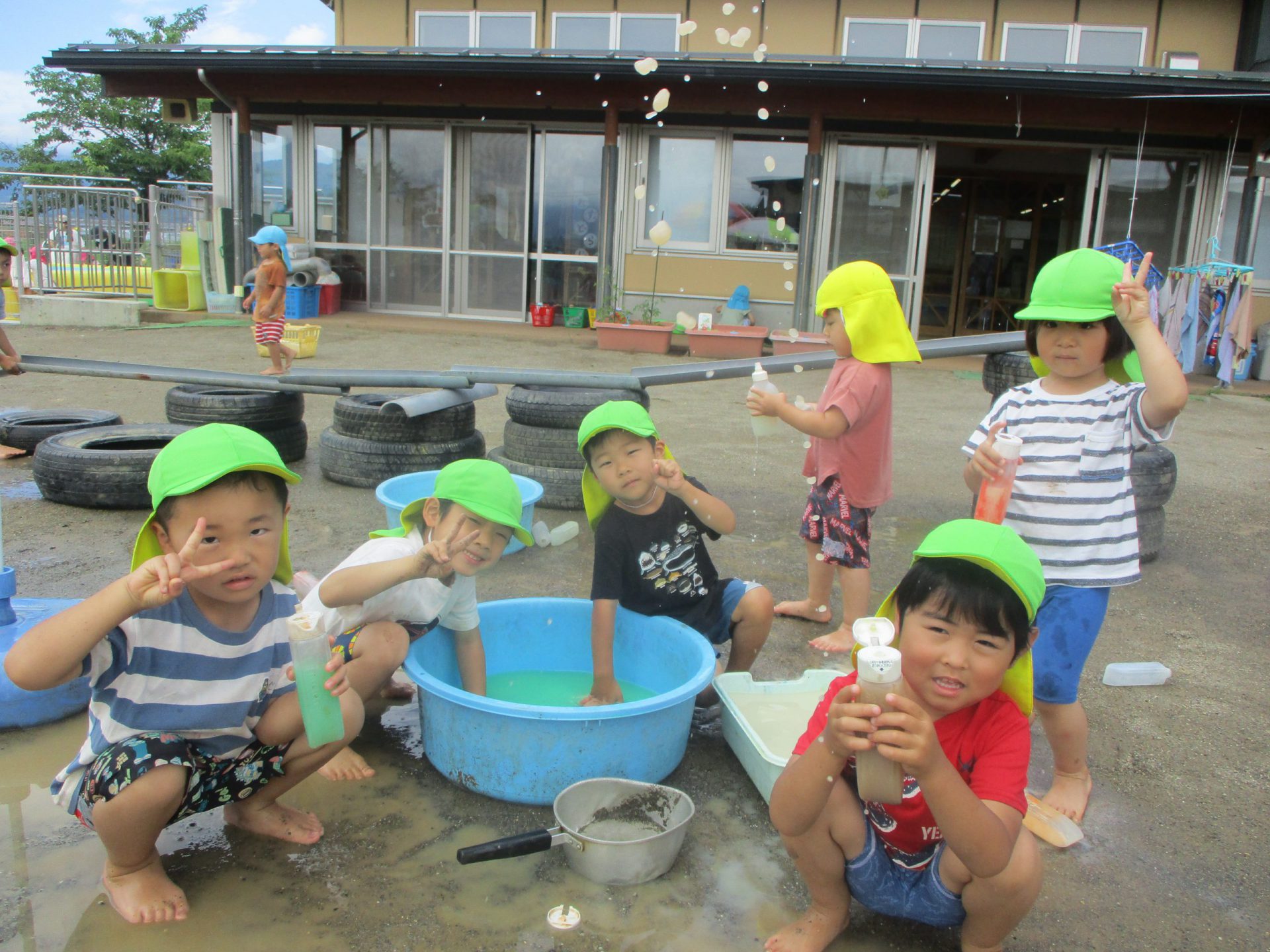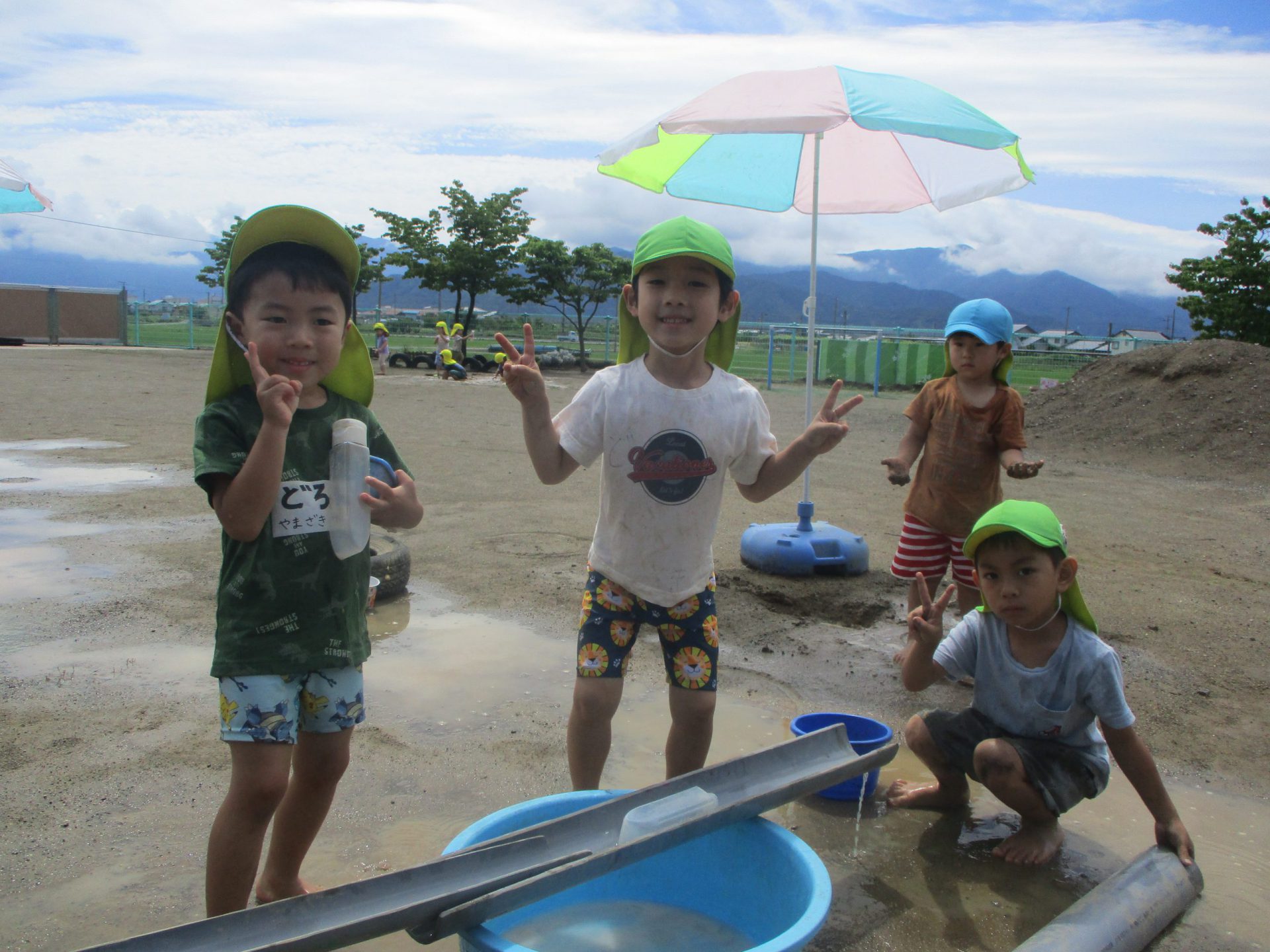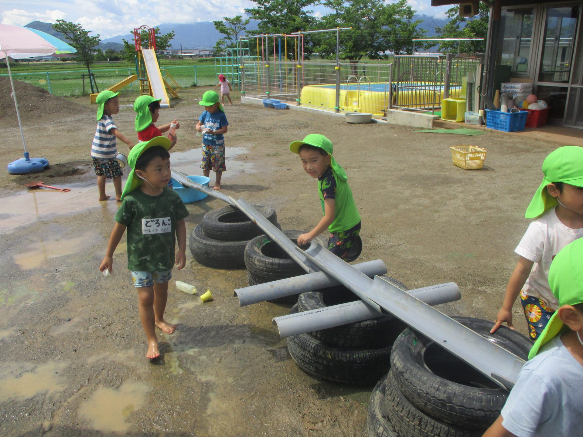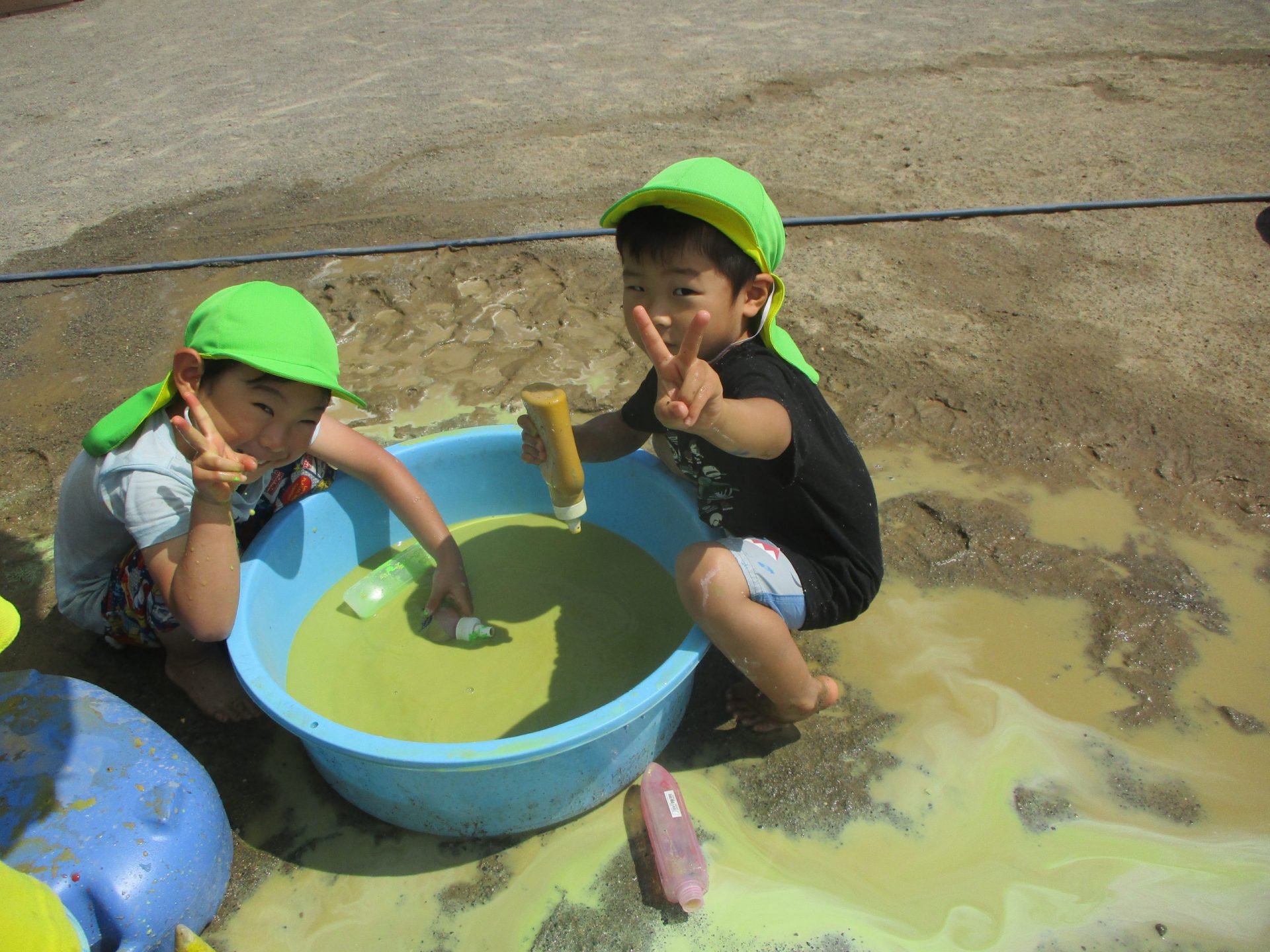・友達や保育士と一緒に工夫しながら、泥遊びを楽しんでほしいと思っていました。絵の具を自由に使えるようにしたことで、色水の濃さや絵の具を混ぜた時の色の変化に気付き、楽しむことができました。塩ビパイプを用意すると、水を流して遊ぶうちに“もっと遠くまで水を流したい”という気持ちをもちました。そのためにどうやって繋げたら良いのかを友達と相談し、試しながら遊んでいました。たくさん考え工夫し、熱中して遊ぶ姿がたくさん見られ、成長を感じました。