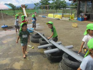 川作りは、塩ビパイプをどうやって繋げれば水が早く、遠くまで流れるのか、友達とたくさん相談しました。