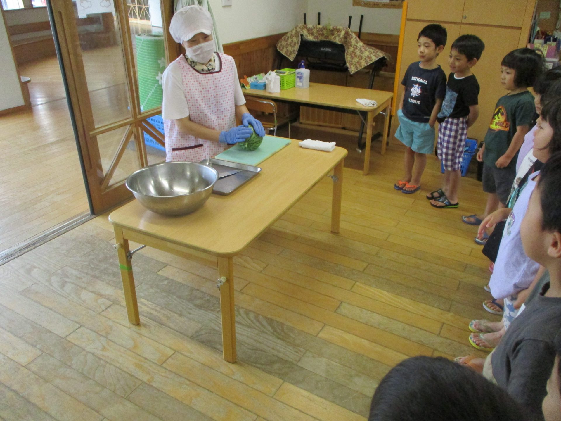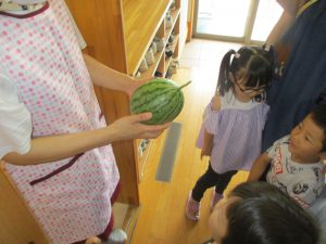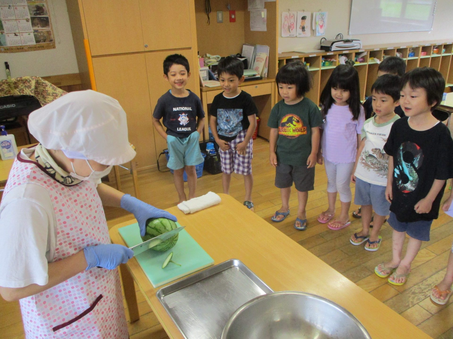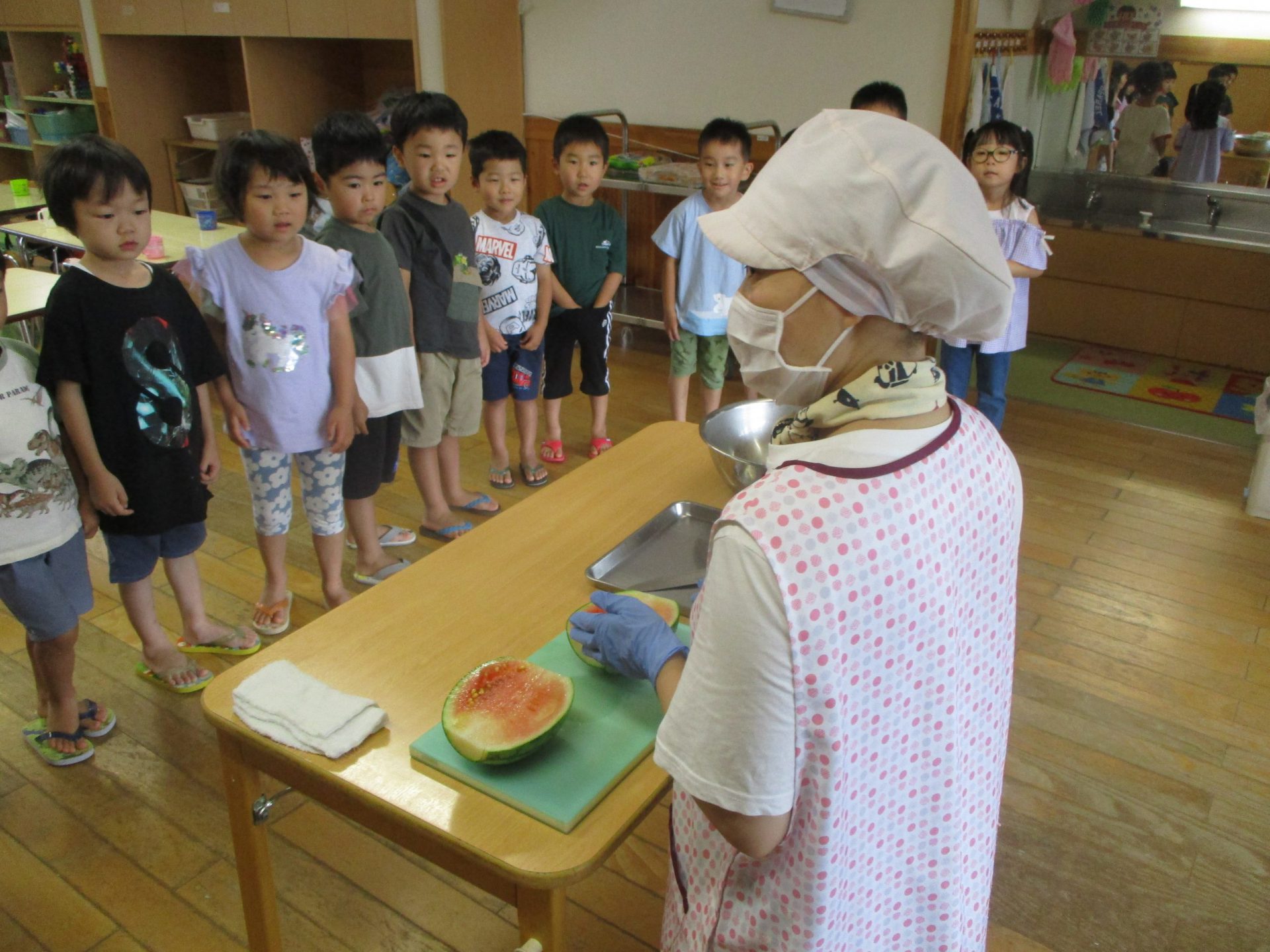 給食の先生が部屋に来て、スイカの解体ショーの始まりです。
