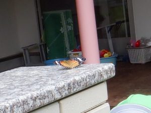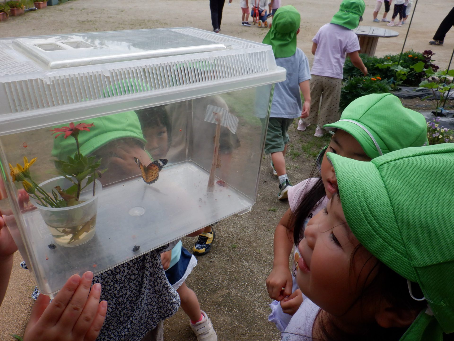 生き物が苦手な子もツマグロヒョウモンの飼育をきっかけに興味を持ち、園庭で生き物を見つけると「飼いたい!」と積極的にかかわる子が多くみられるようになりました。現在は、花壇にいたツマグロヒョウモン2匹とテラスに迷い込んだコクワガタ1匹を大切に育てています。飼育や別れの経験を通して,命の大切さについても少しずつ考えていけるようになるといいなと願っています。