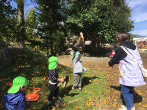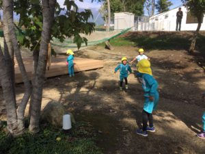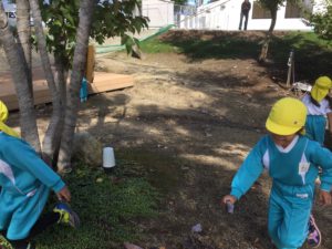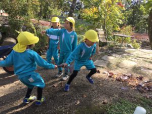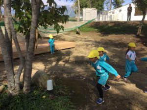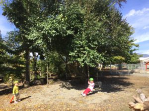 2歳児は、森の落ち葉やターザンロープでたくさん遊びました。