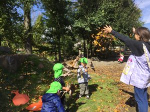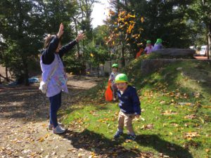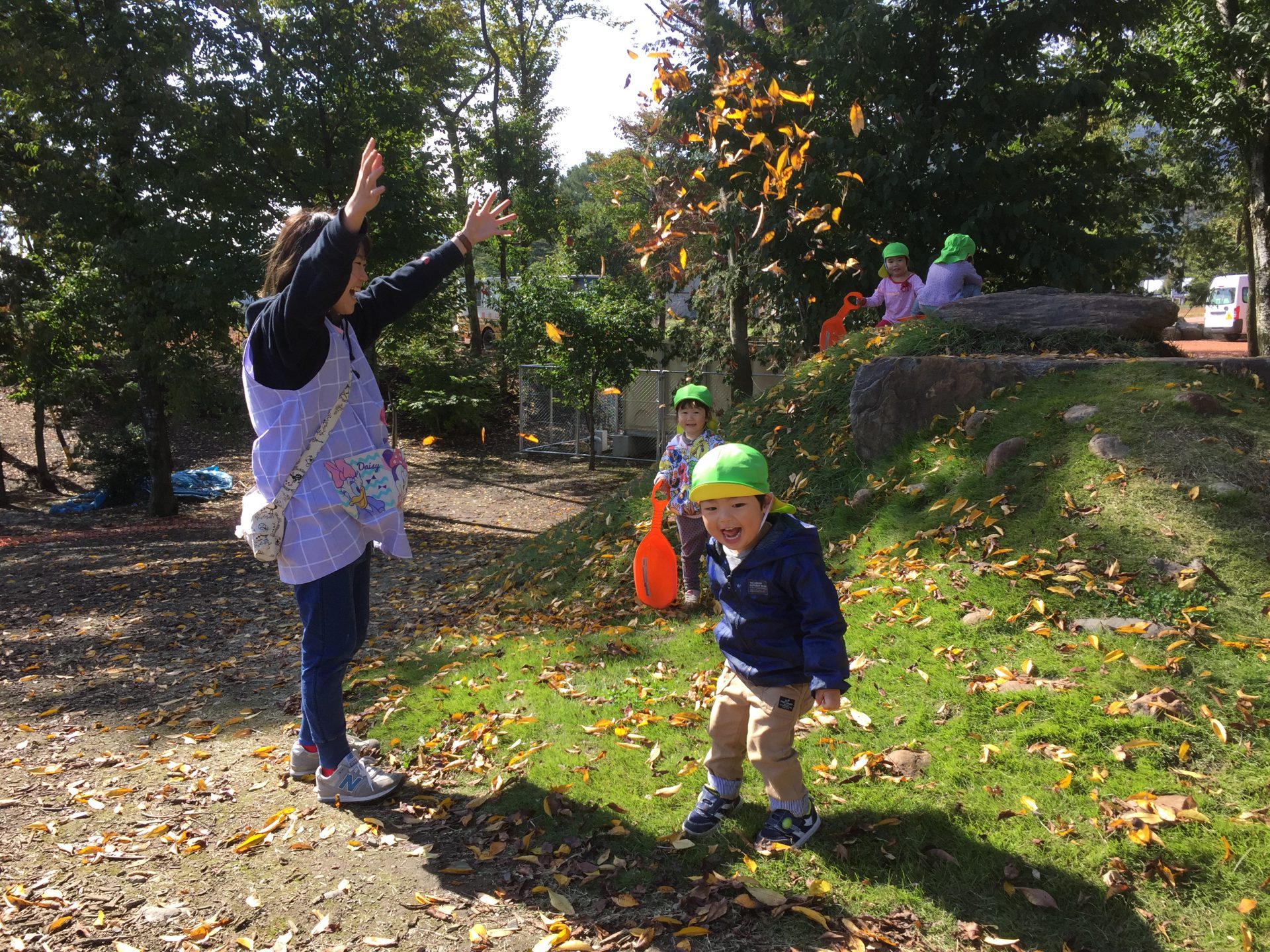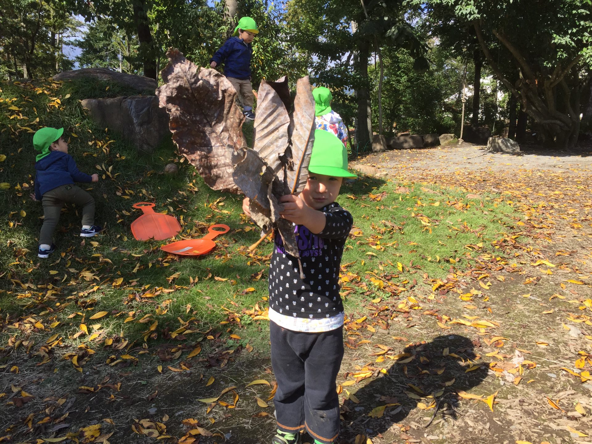 落ち葉をあつめて葉っぱのシャワーに大興奮!大きな葉っぱもみつけました!