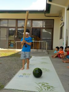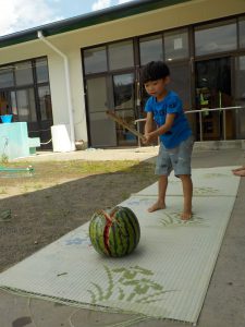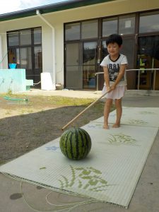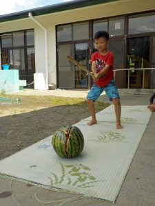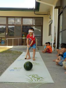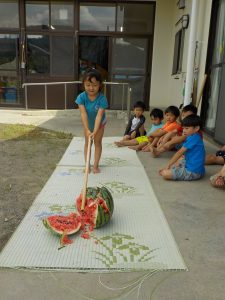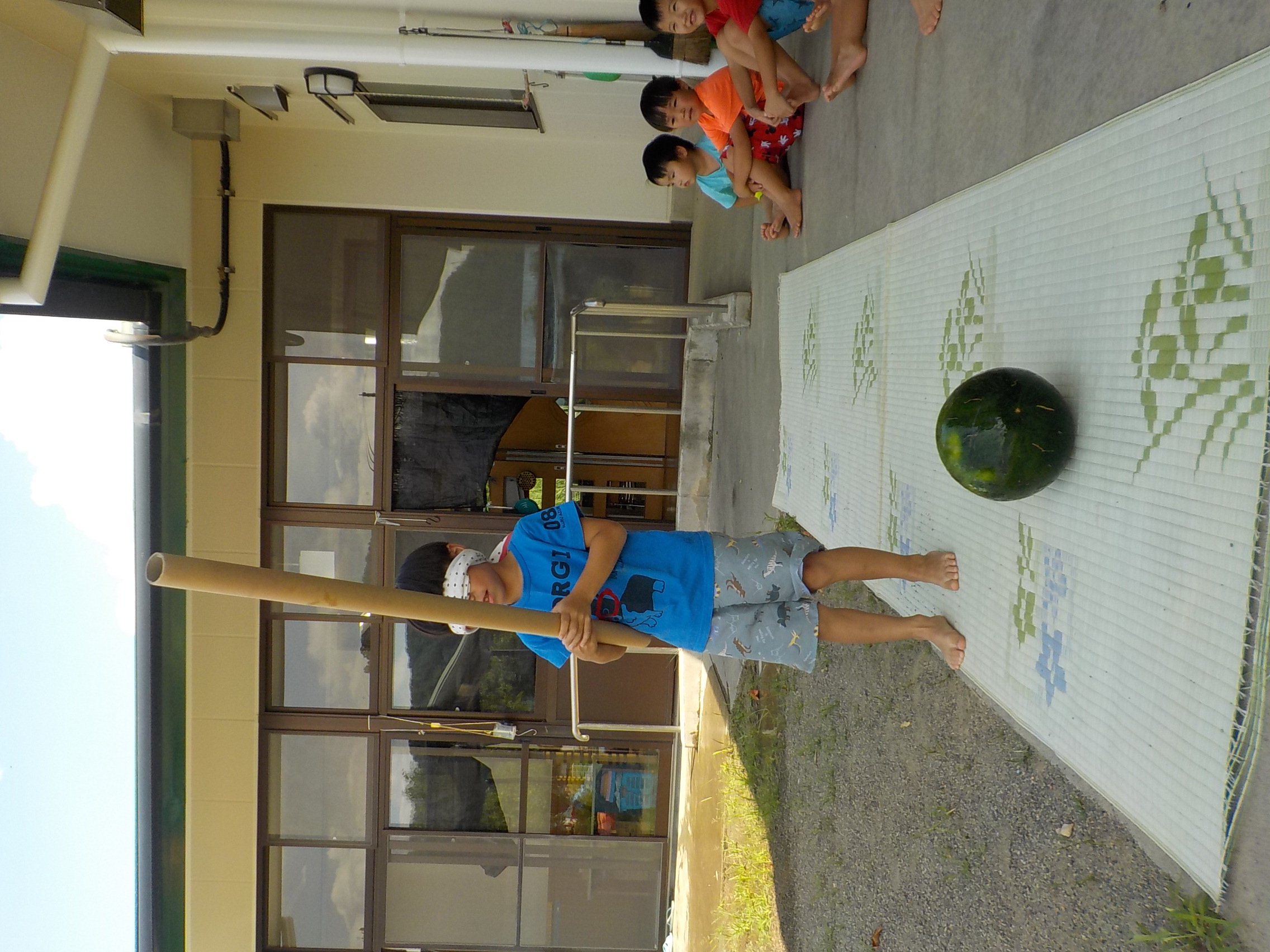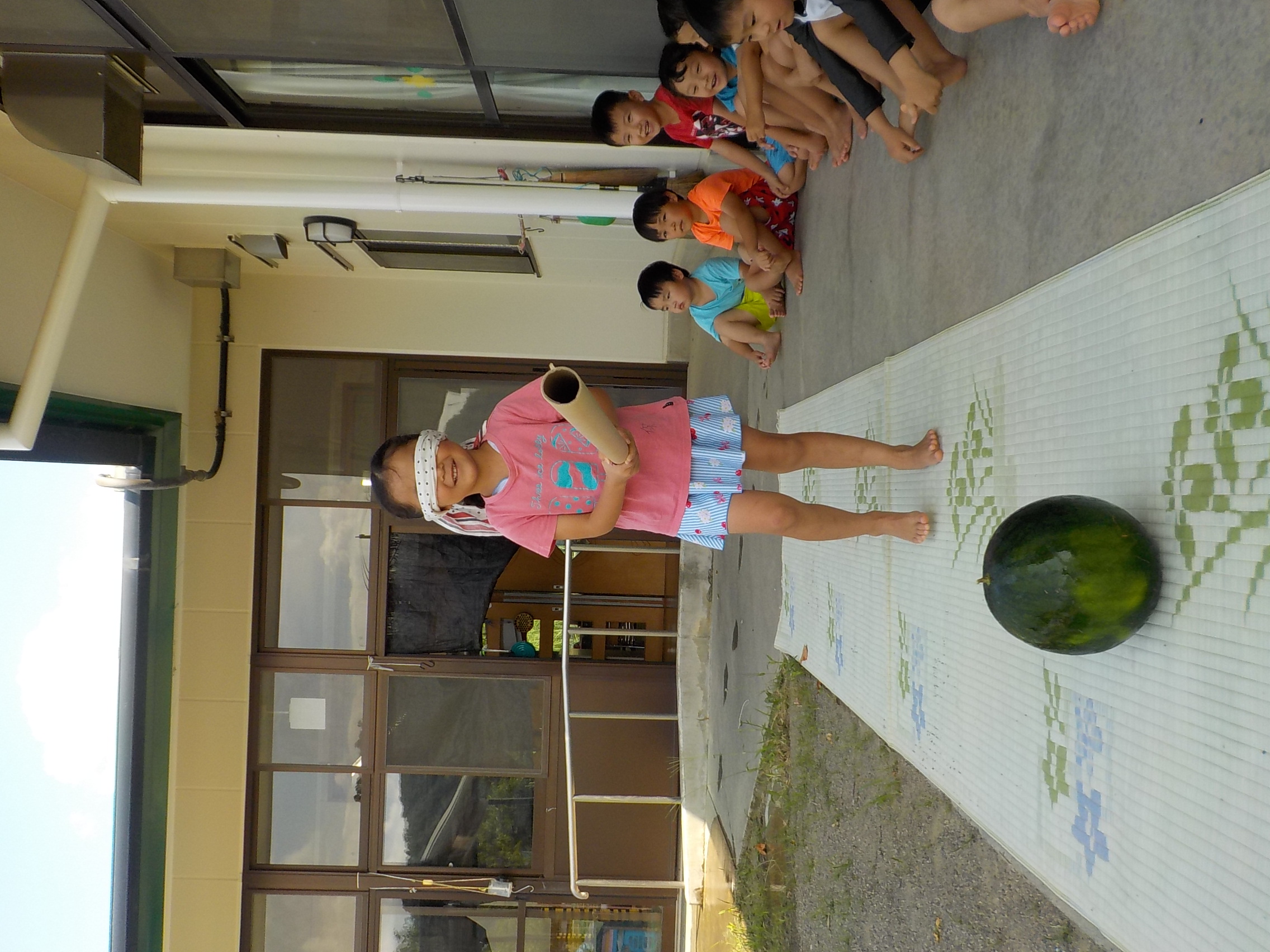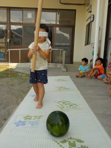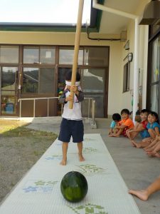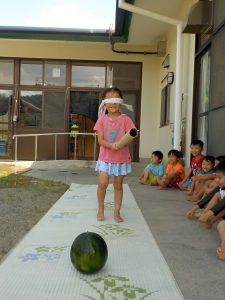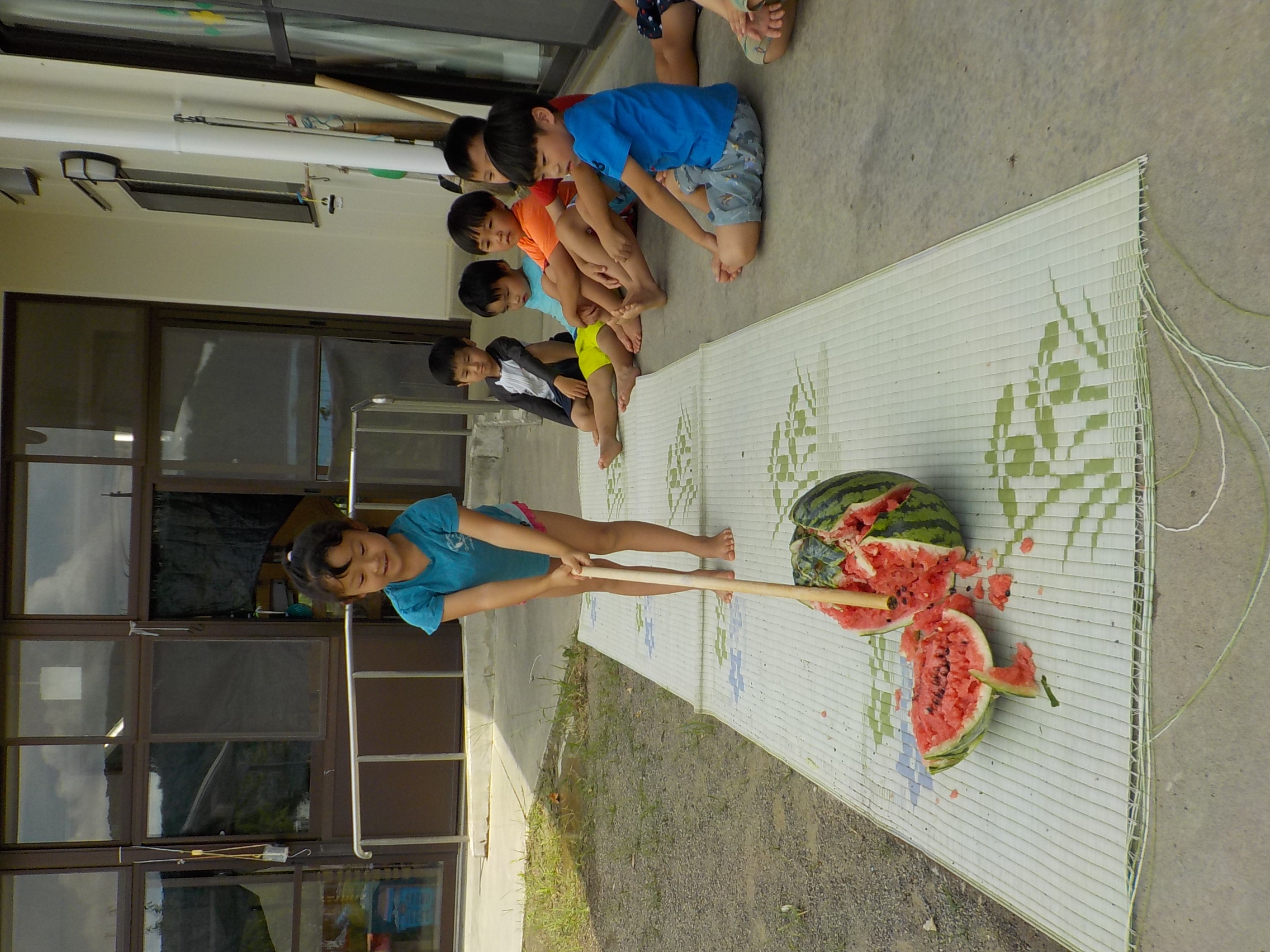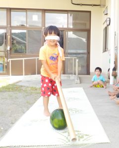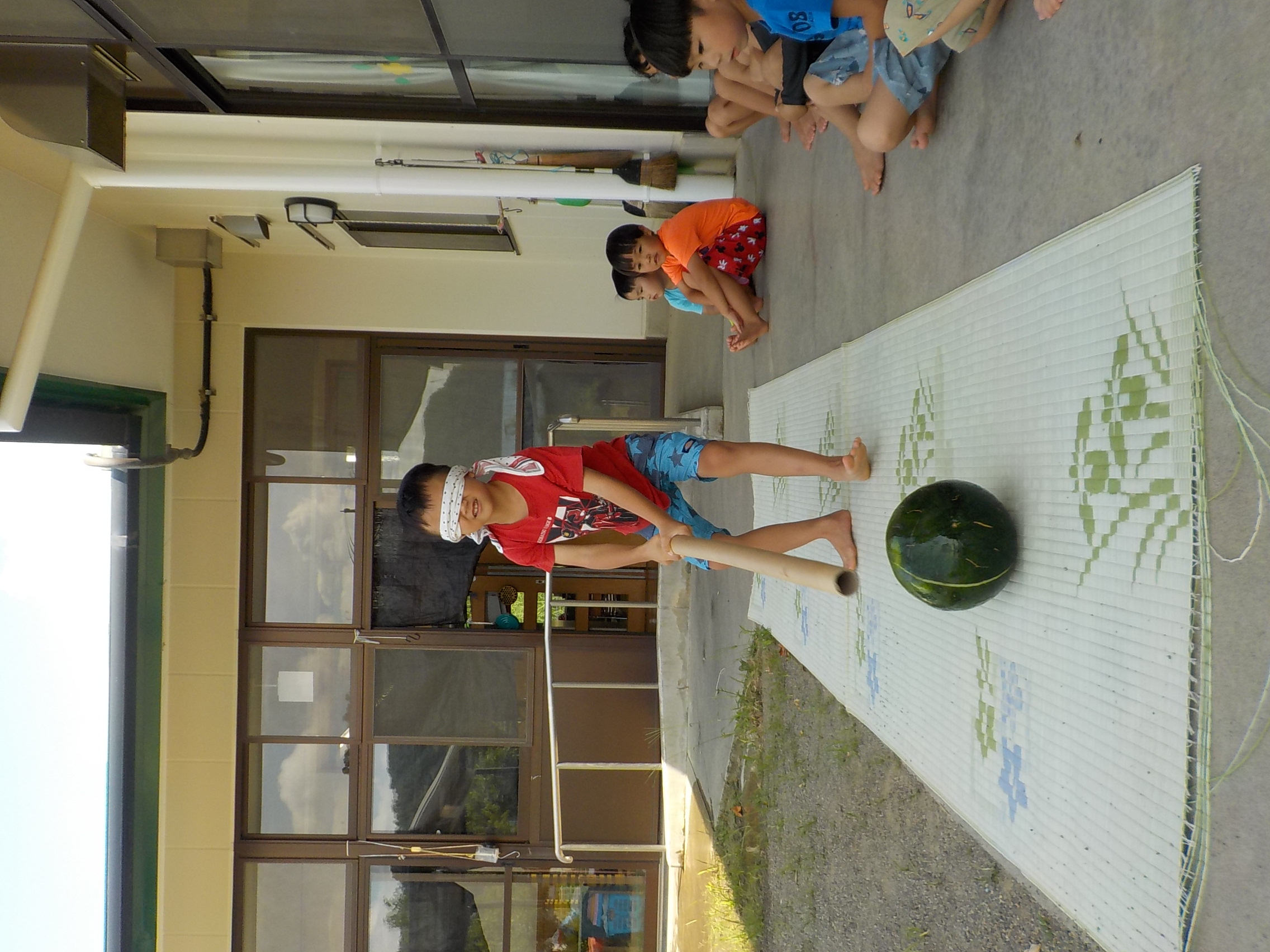 もう一個は、目隠しなしで狙いを定めて挑戦!!みんなで順番にスイカを叩き、最後に年長さんが挑戦すると、きれいに割れました✨