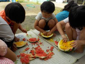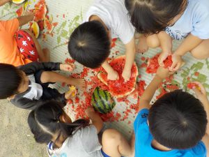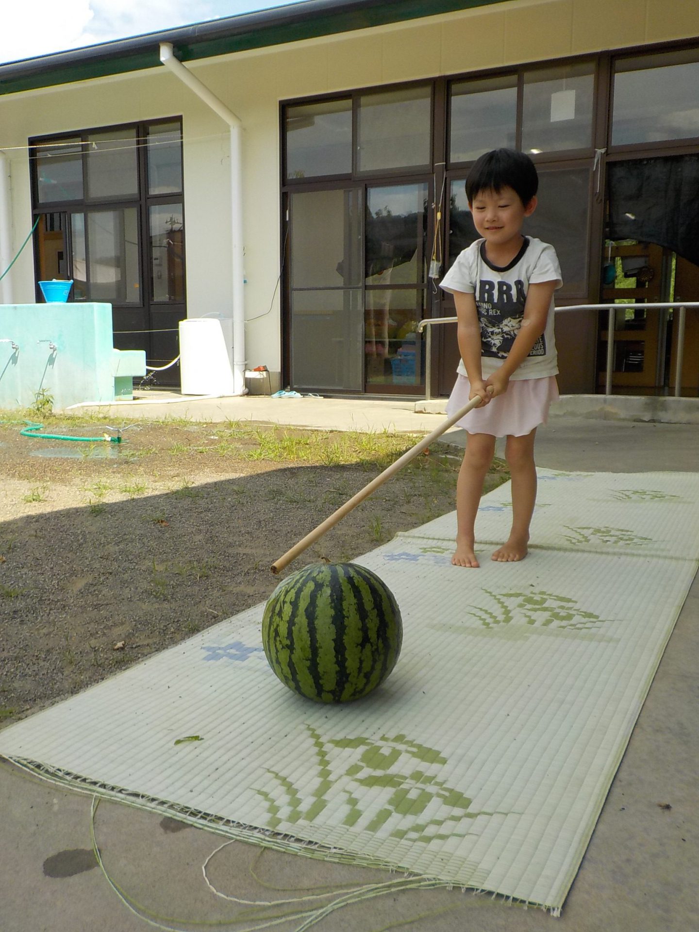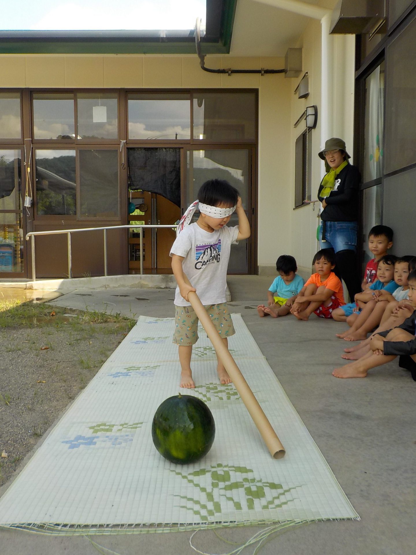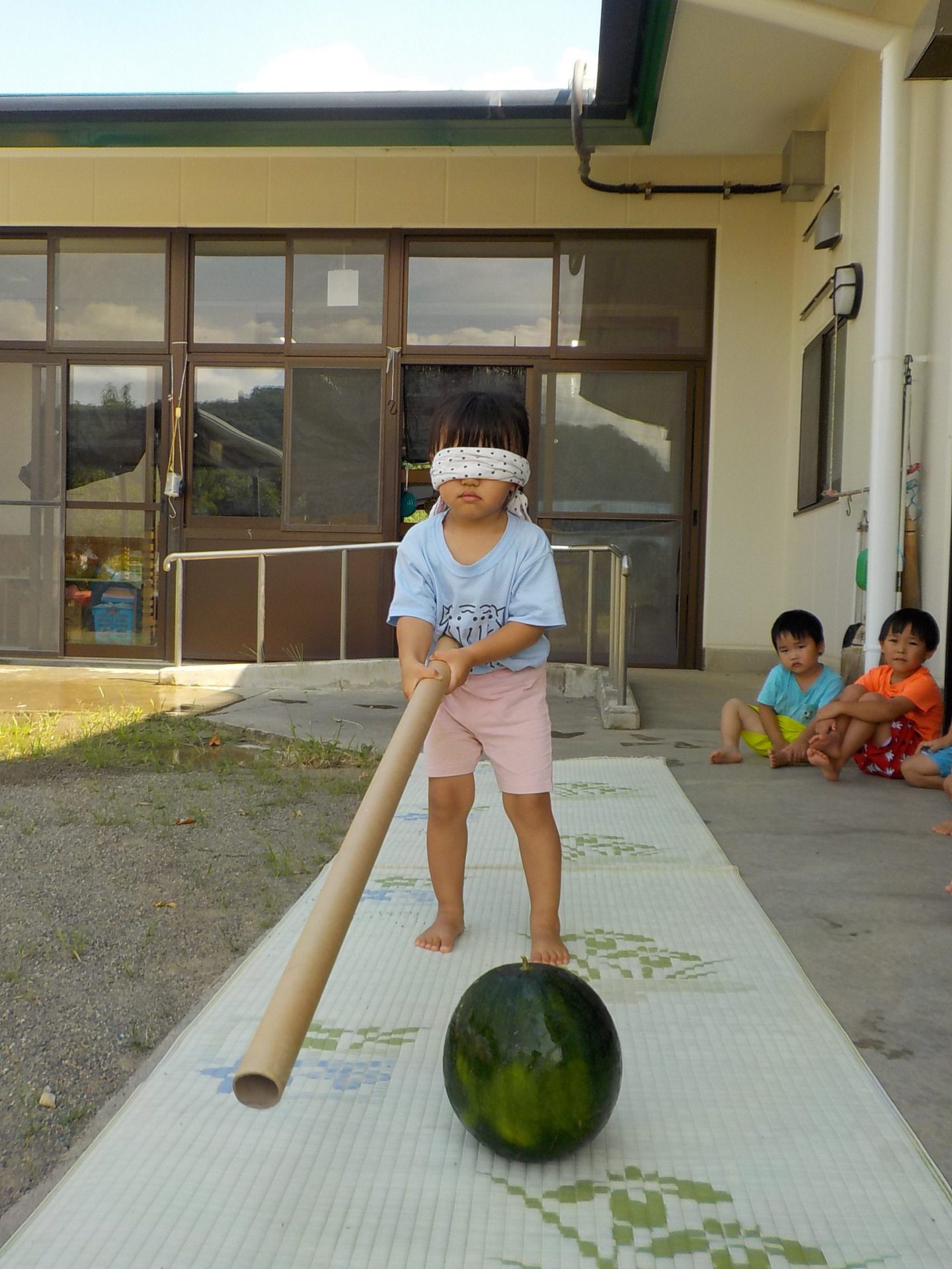 スイカ割りを通して、目や耳、匂いや感触など五感を使って、沢山の発見が見られました😊