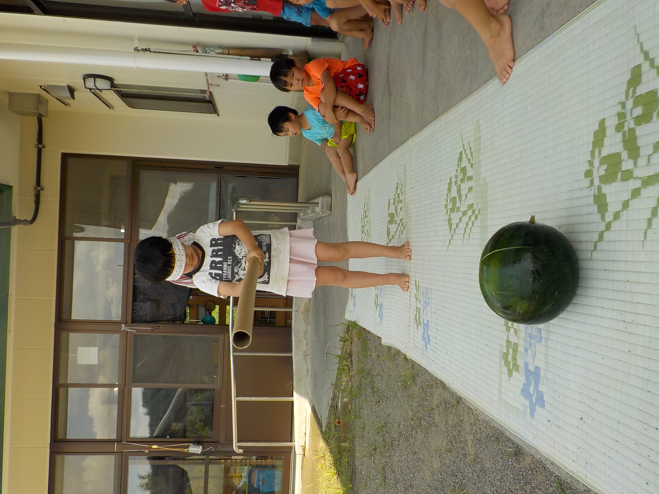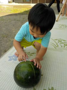 2歳児さんが一言・・「割れない。みんなでやろ」と提案してくれたのでみんなで割って見ると大きなスイカがきれいに割れましたよ😄