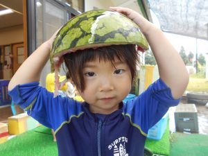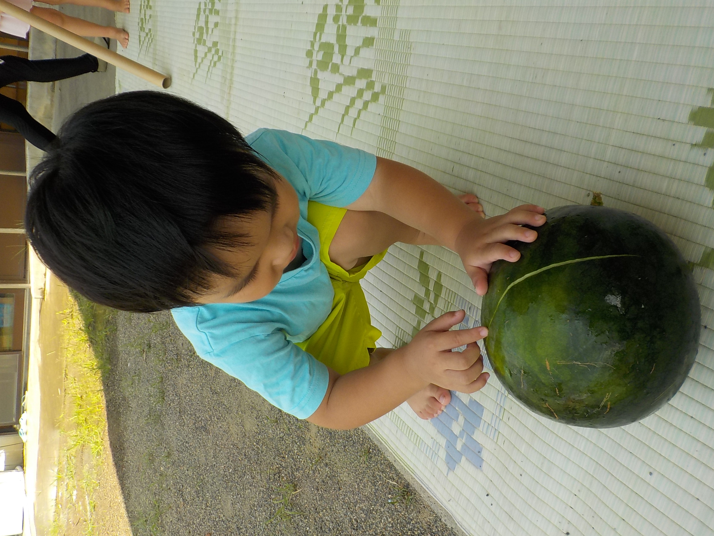 朝、お部屋にスイカが登場すると「わ!スイカだ!」「おっきいね!」「おいしそう!」「スイカ割りする??」と思い思いに言葉にしてスイカに触れる姿が見られました!