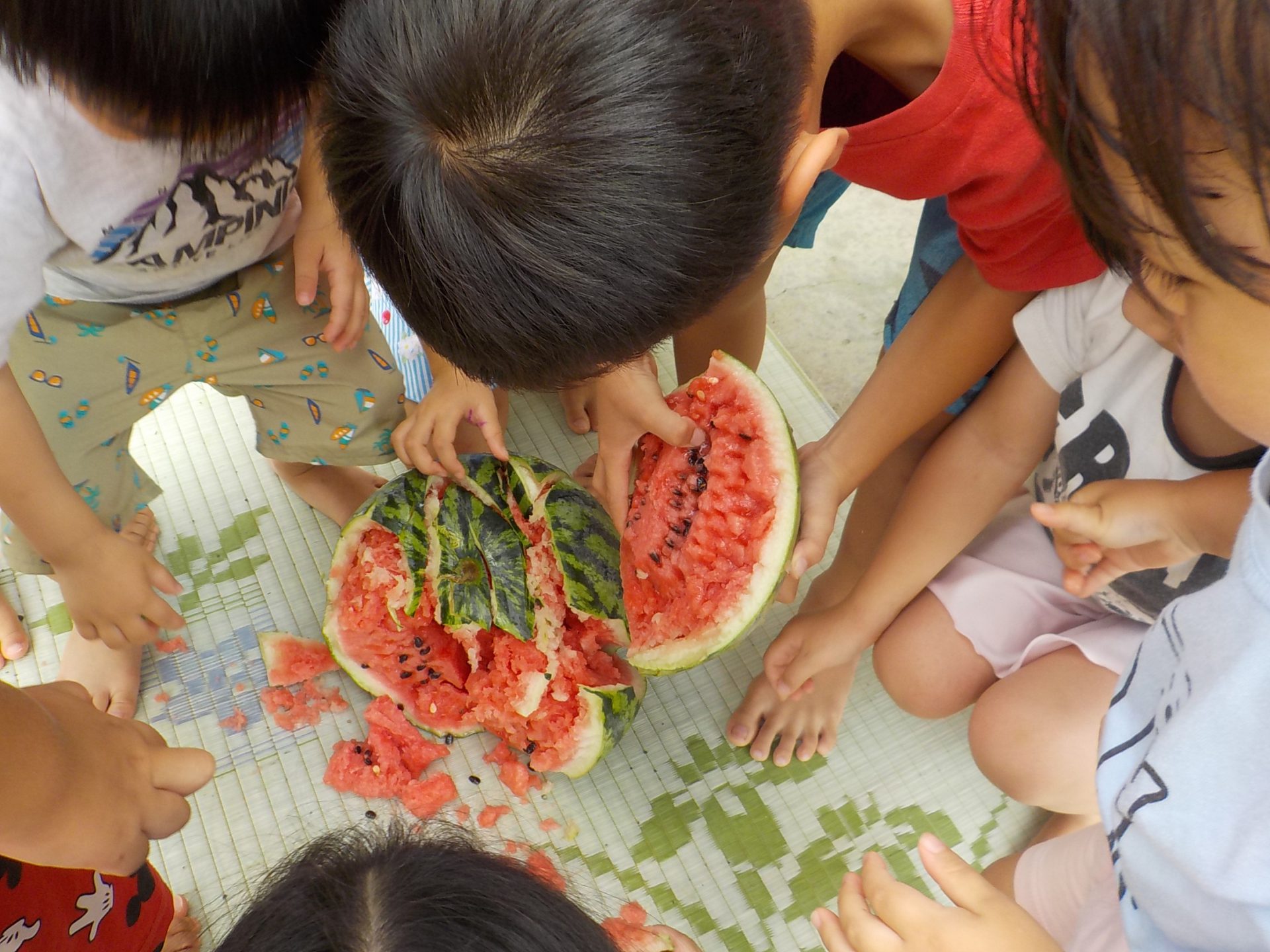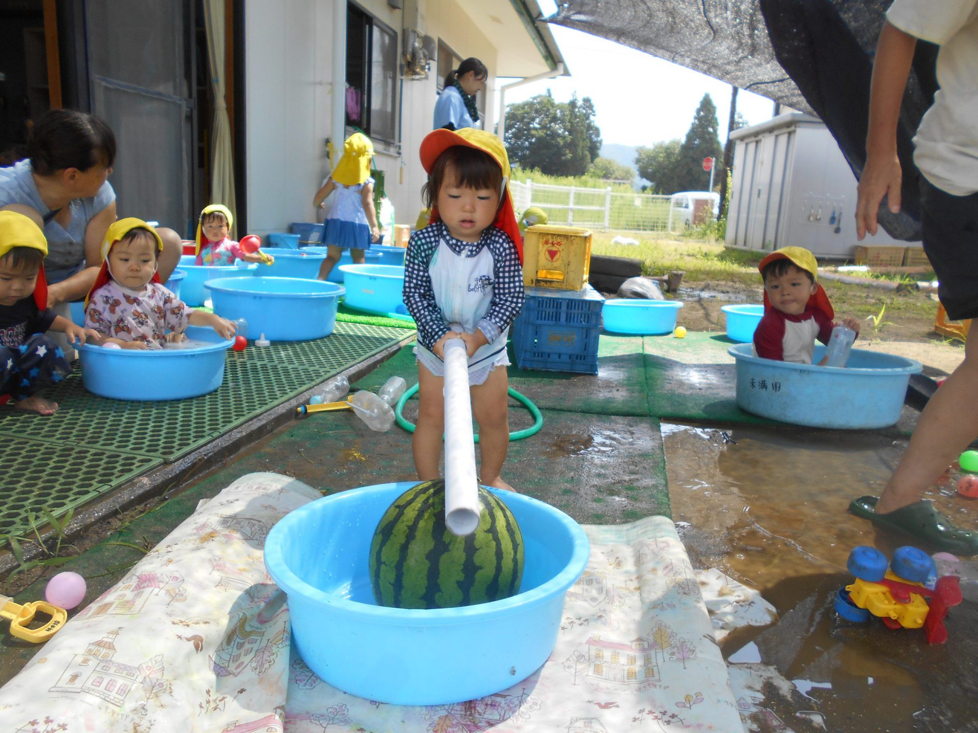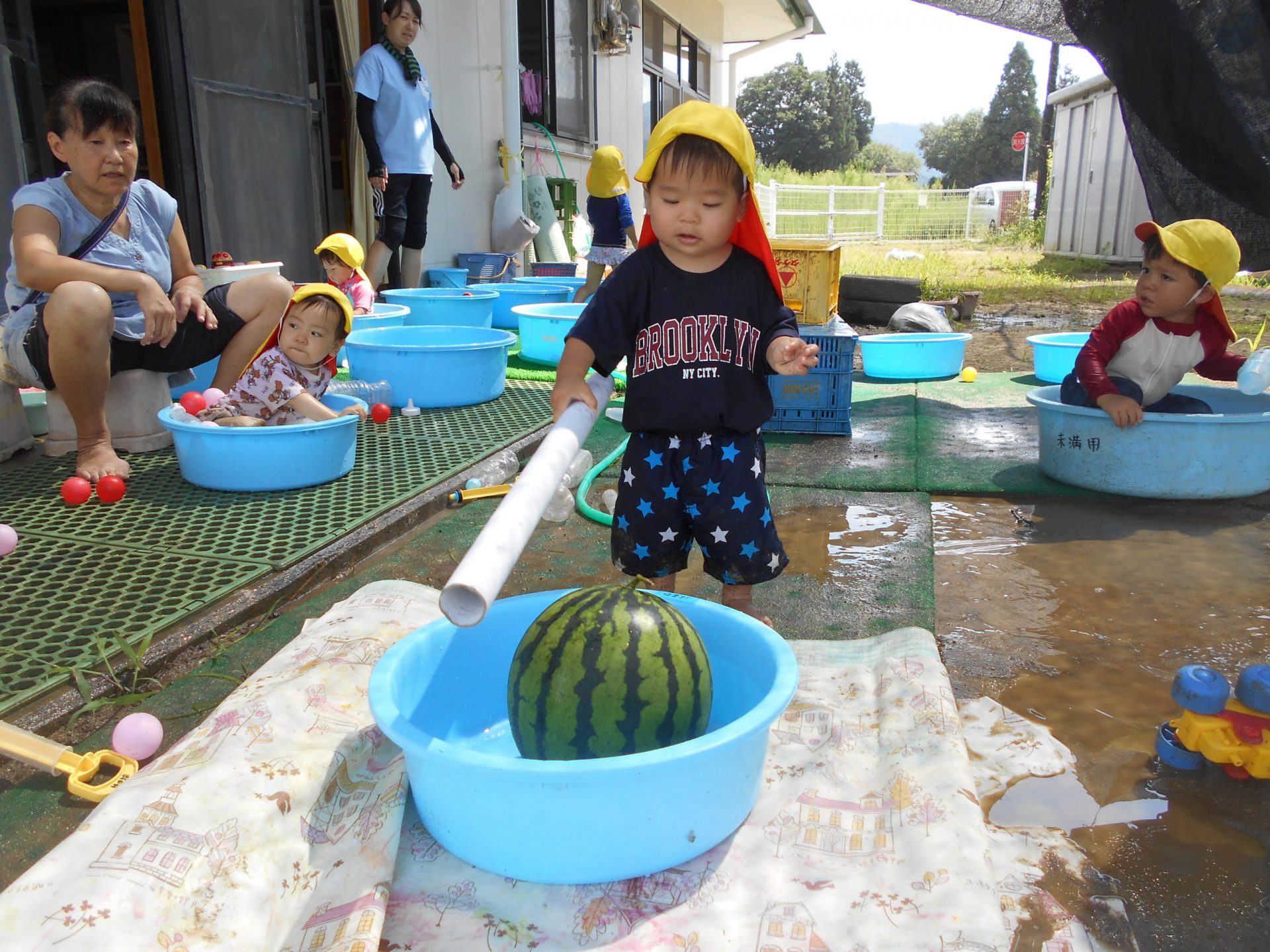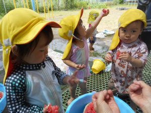 「冷たい!!」「スイカの匂いする!」「気持ちいい!」とみんなでスイカを丸く囲んで楽しみました!