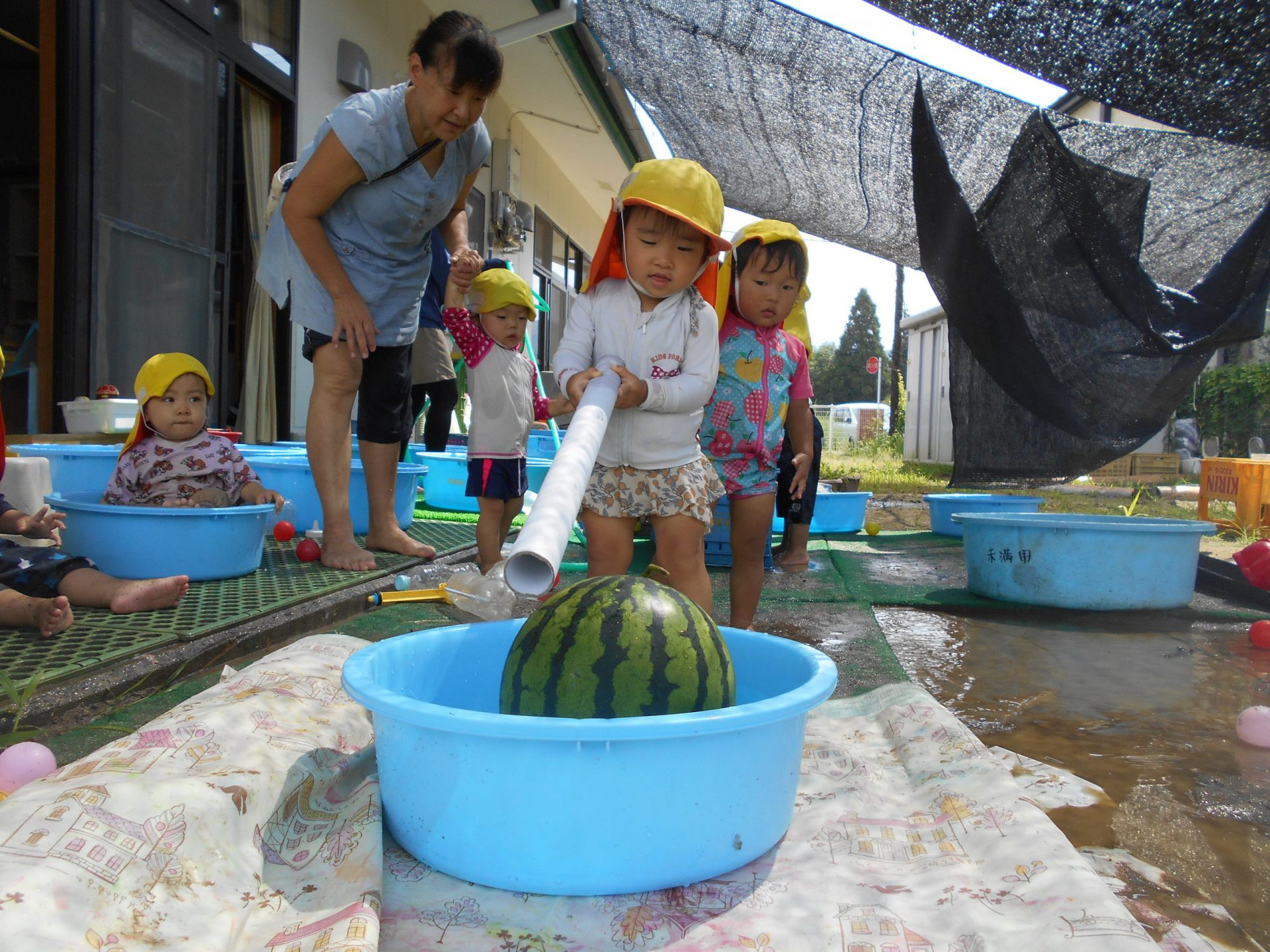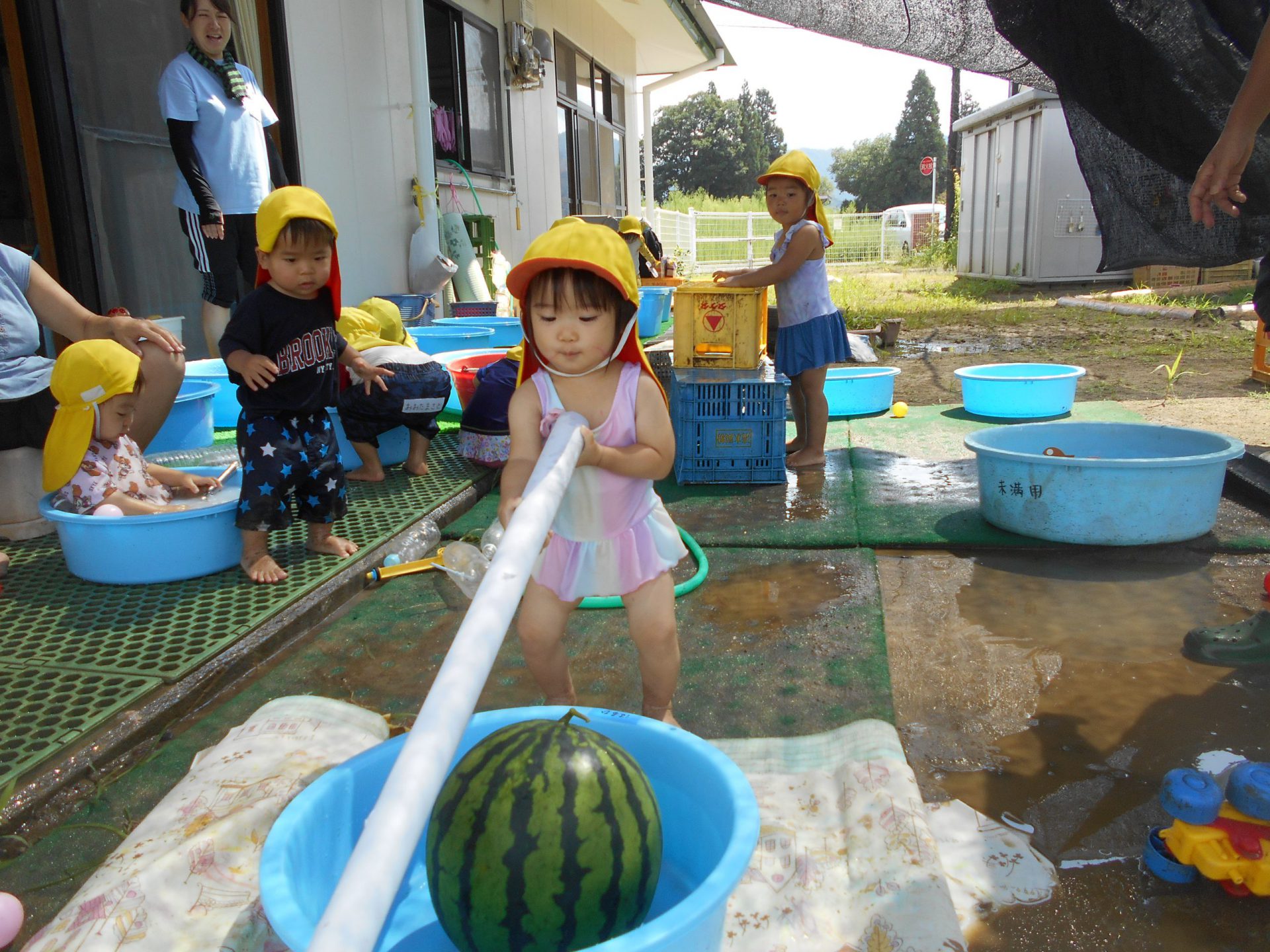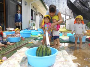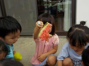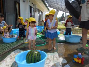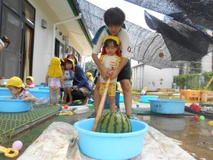 「冷たい!!」「スイカの匂いする!」「気持ちいい!」とみんなでスイカを丸く囲んで楽しみました!