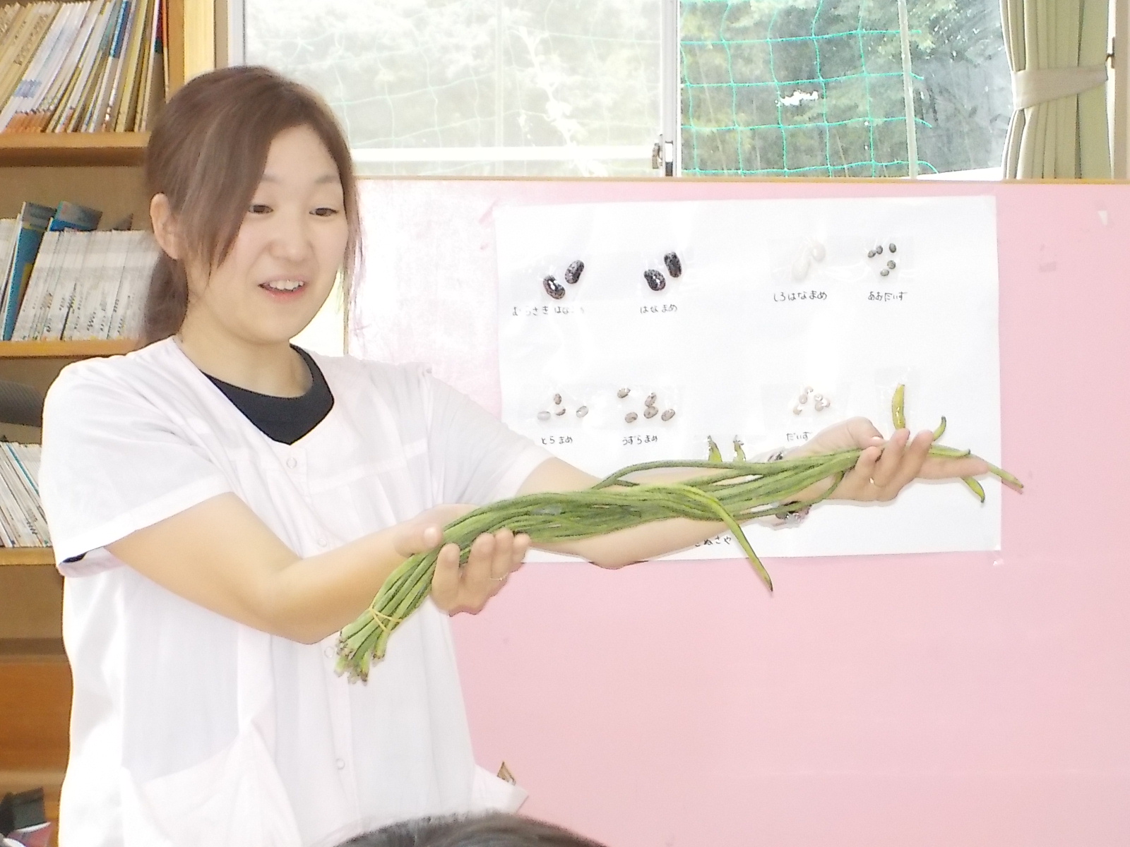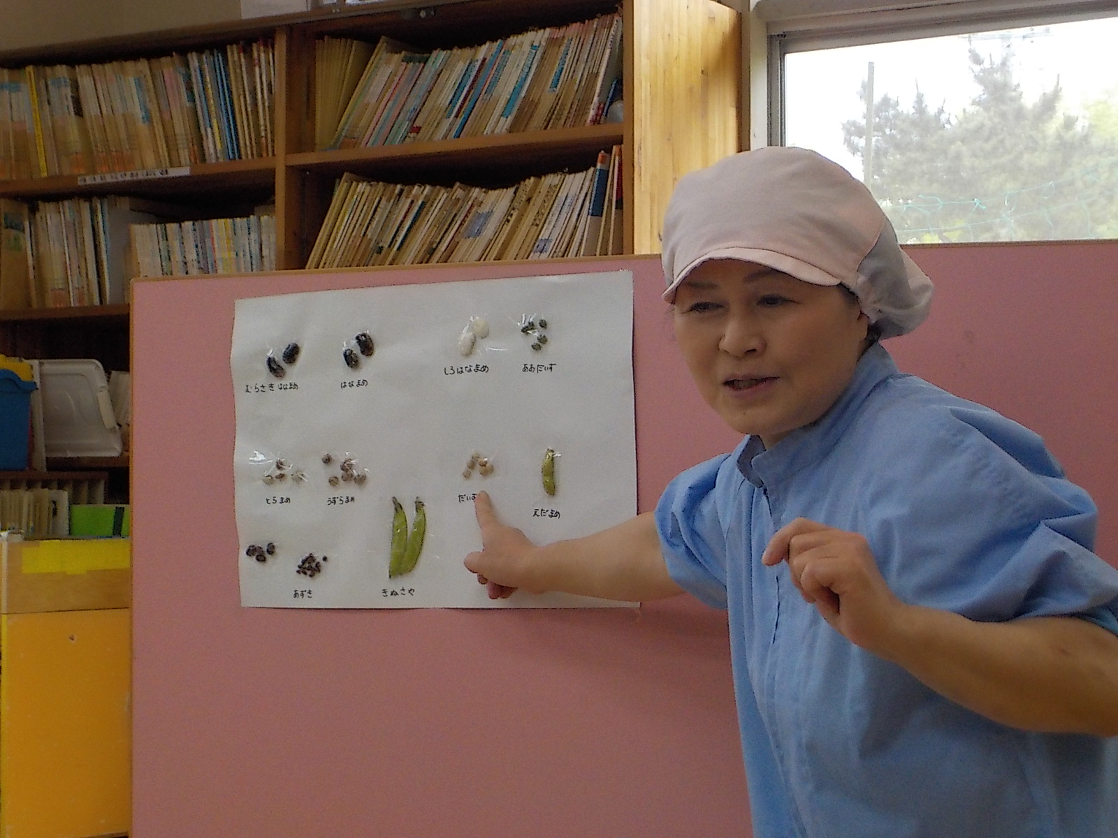 調理員は、豆の名前やどんなお料理になるか等を話してくれました。「食べたことあるよ〜」子ども達から、そんな返事がありました。