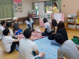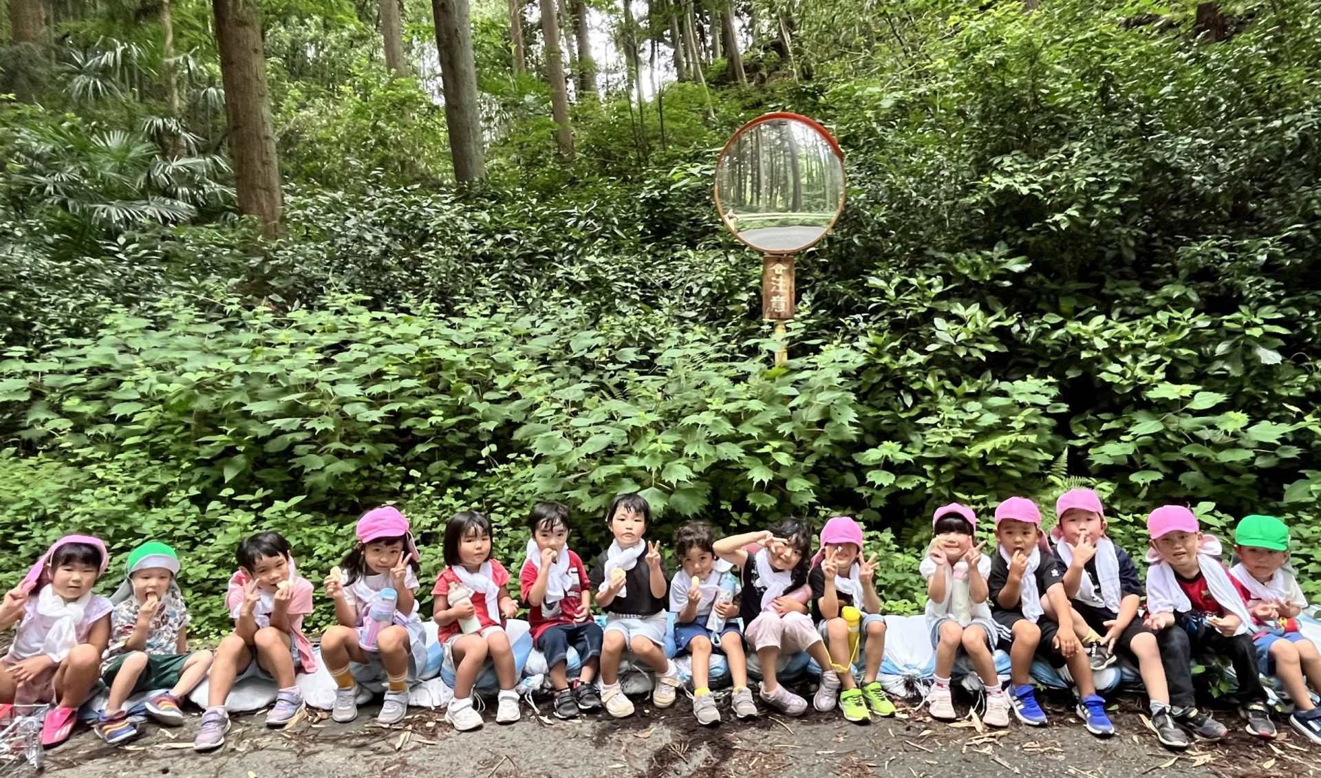 保育園までの帰路、林の中に入ると「気持ちいい!」「涼しいね」と肌で感じた子ども達。道路脇に座って「ひと休みひと休み」元気をチャージしてから、保育園へ向かました。