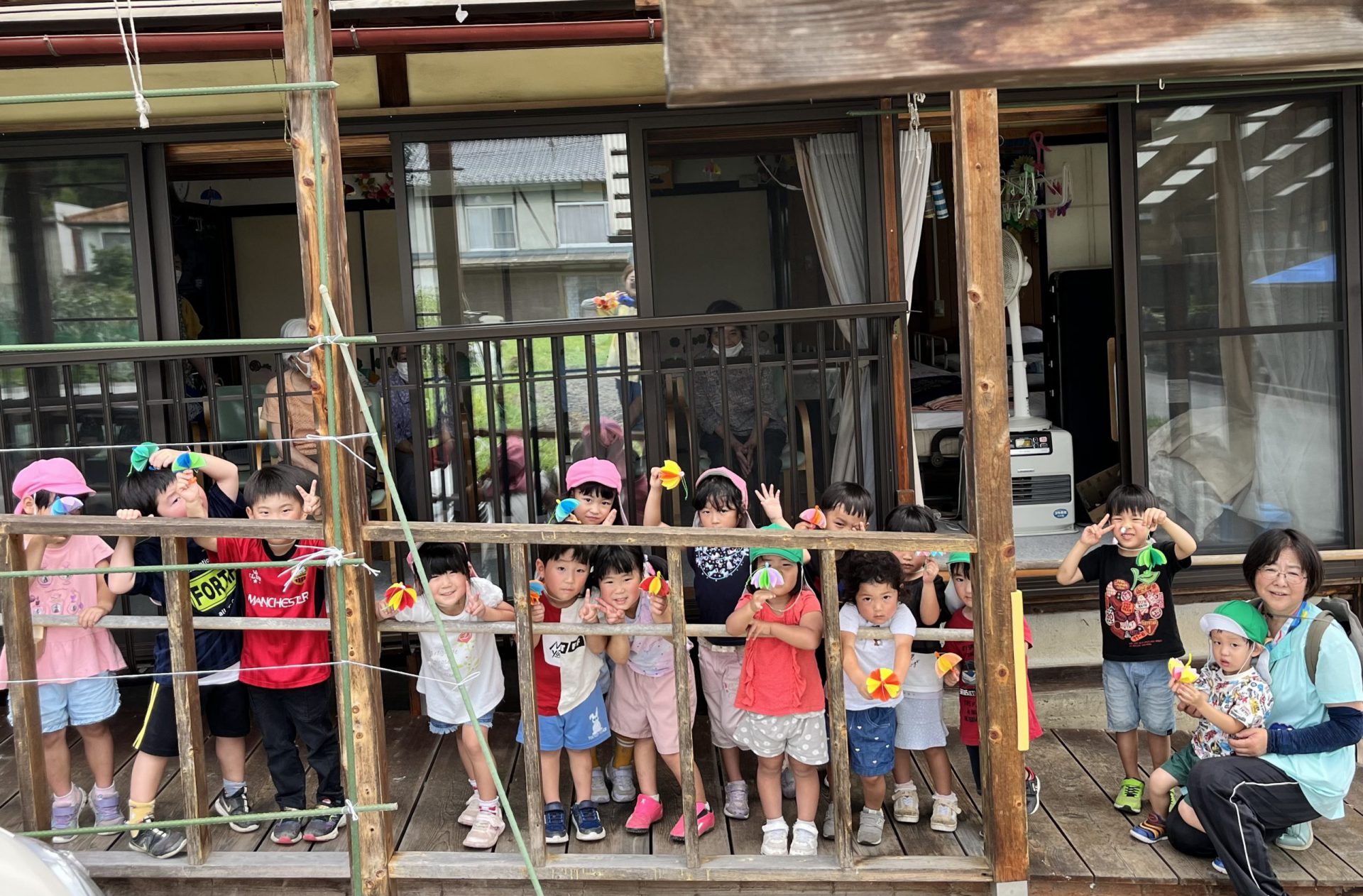 そんな畑で元気に走り回っている様子を、畑のすぐ隣にあるグループホームの利用者さんがニコニコ見守ってくれていました。「皆の元気をお届けしよう!」と大好きな踊りを披露すると、手を叩いて喜んで下さり「お礼に」と手作りの傘の飾りを頂きました。子ども達は、大喜びでした。