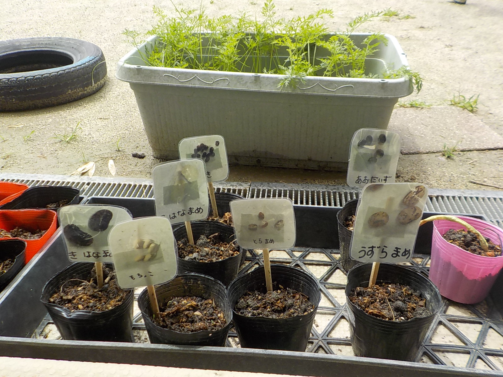 そして「この豆、植えてみたい」と子どもから提案が・・・先日の種まきの体験から思いついたようです。ポットにそれぞれの豆を蒔きました。「どうしても長い豆も作りたいの!」という要望もあり、三尺豆も購入して蒔きました。現在、小豆と三尺豆が生長中。他の豆は・・・残念でした。