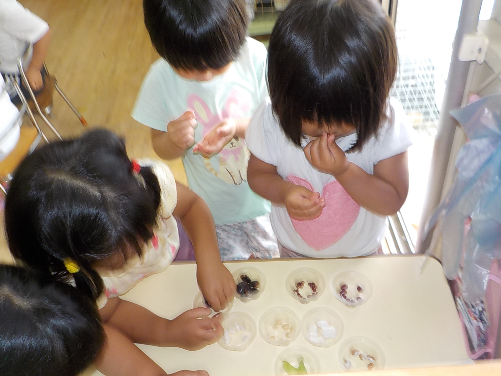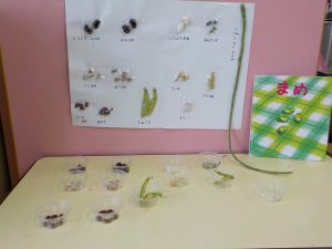 年中ゆり組の子ども達は、年長さんに教えてもらい大豆の種を蒔き、自分達でも四角豆を育てています。そんな折り、一人の年中児が「僕の名前がついた豆があるんだよ」と呟きました。担任は、「いろいろな豆があることを教えてあげたい!」と、豆の絵本や図鑑を読んだり、給食の調理員と相談し、いろいろな種類の豆を集めました。