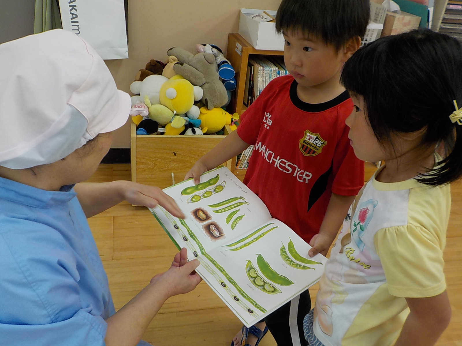 実物の豆と図鑑を見比べて、「この豆、こんなに長いんだに!」「豆の色のな、花が咲くんな」「花と豆の色って、きっと一緒じゃない?」「この豆、何て言うの?」「これ(落花生)、お家にある。食べたことある」調理員に質問したり、自分達の発見を教えてあげたりしていました。