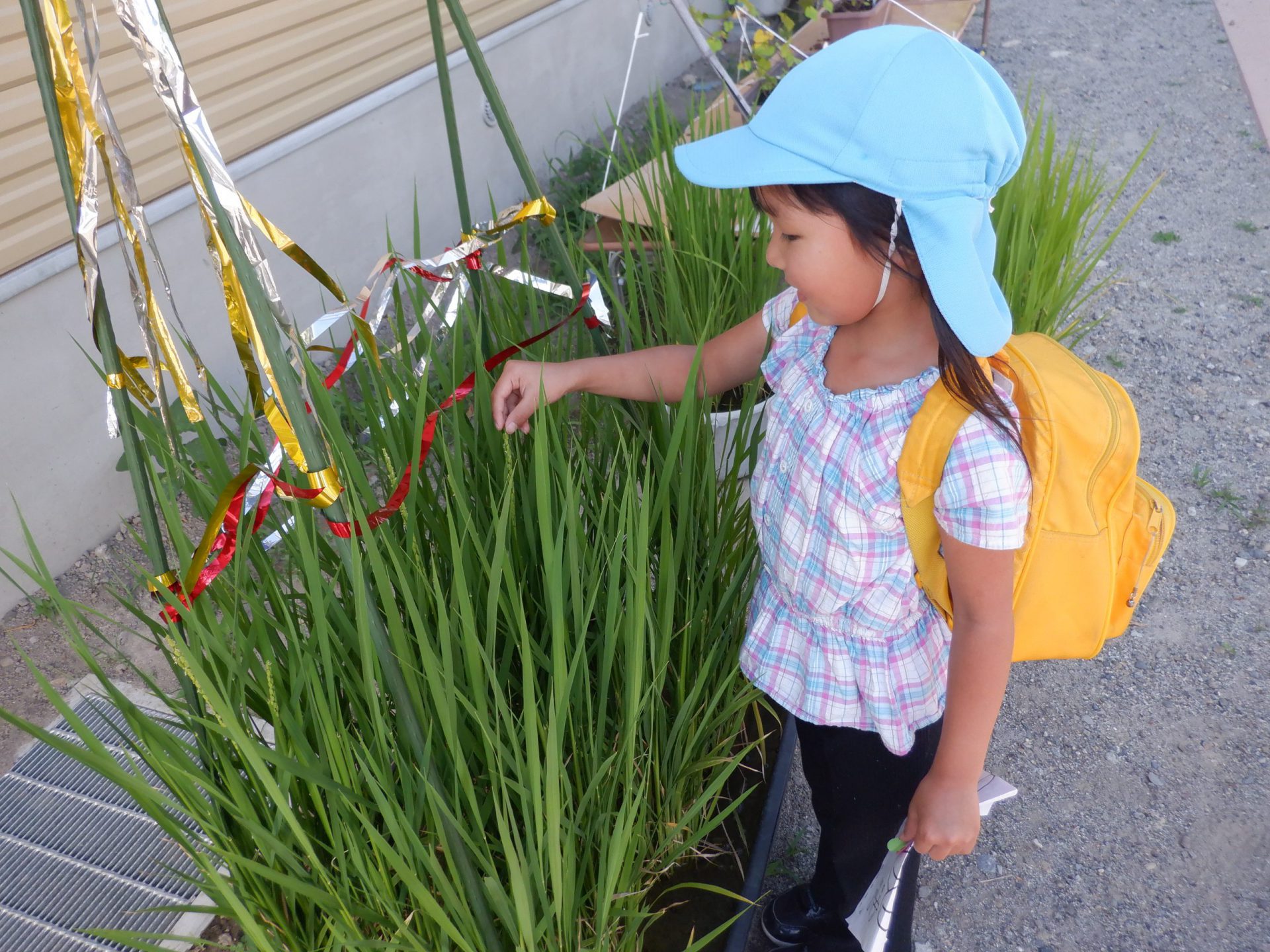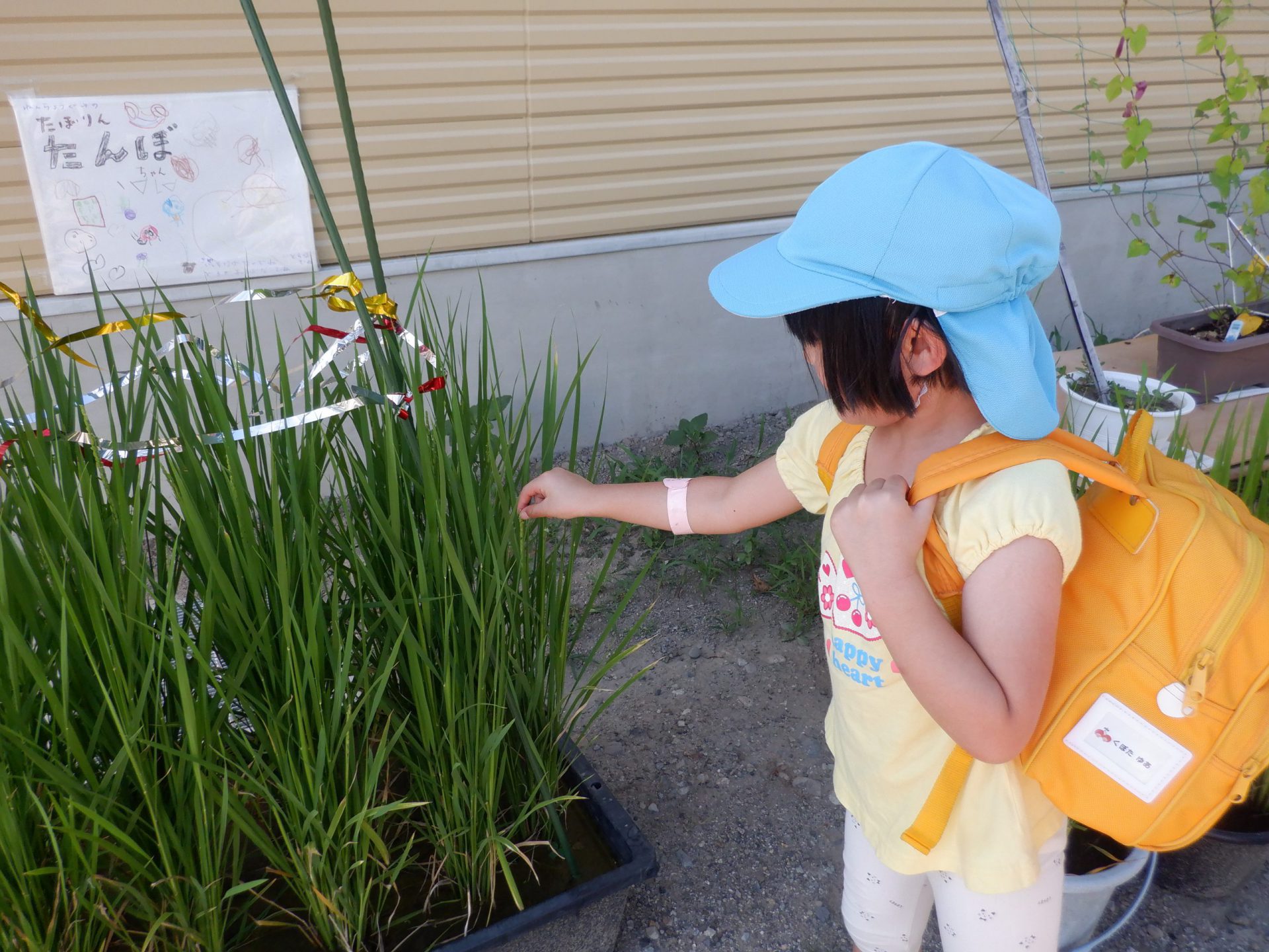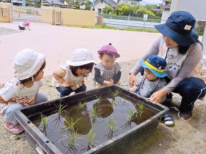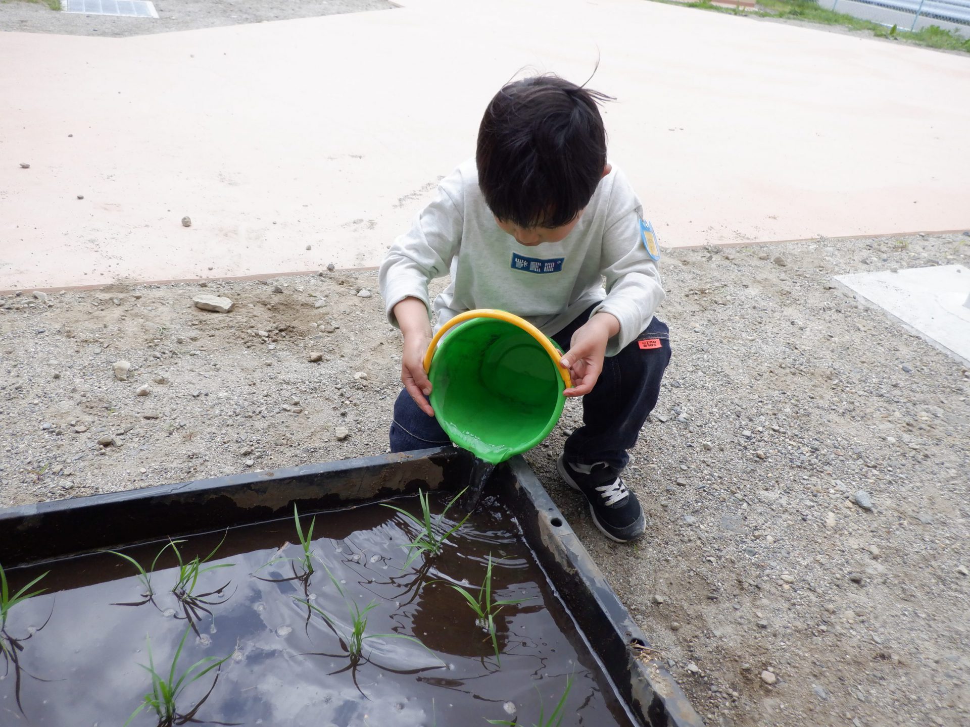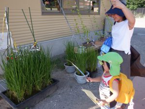 5月、年長さんが園庭に小さな田んぼを作りました。