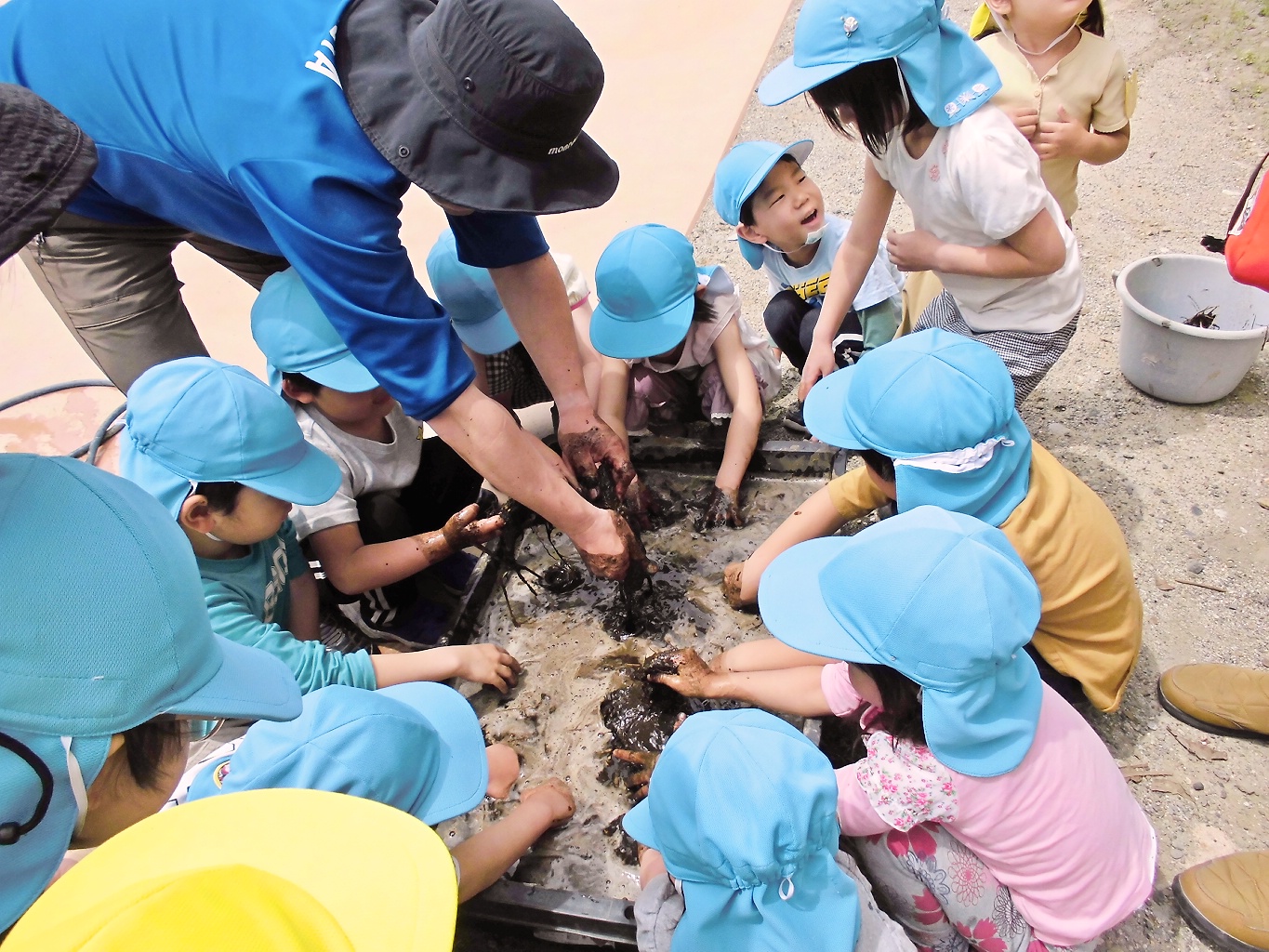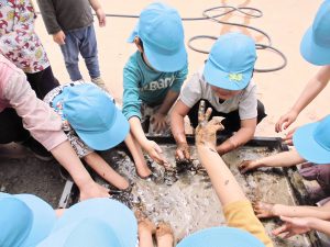 「なんかドロドロだね!」「気持ちわるーい!」「えー、気持ちいいじゃん」夢中でこねます。みんなの手は、あっという間に”どろんこ星人”