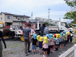 市内の若手農家の方で、子どもさんも市内のこども園に通っていらっしゃり、子どもたちに質問に、田んぼのこと、機械のこと、笑顔で優しく教えてくださいました。