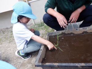 そして、いよいよ田植えの日。届いた苗を年長さんが早速、プチ田んぼに植えていきます。