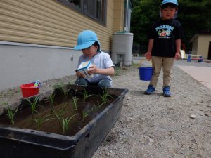 あんまりせまく植えてしまうと、大きくなったときに窮屈になるから、間隔も慎重に・・・。「この辺でいい?」保育士に聞きながら植えていきます。