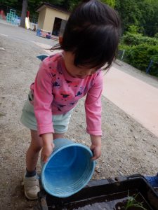 せっかく植えた苗が倒れないように、角の方からそっと水を入れてくれる子もいました。