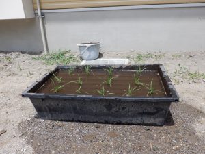 固くなった土が入った大きなたらいに水を張り、苗を植えられるように土を柔らかくする、『代かき』も自分たちでやりました。