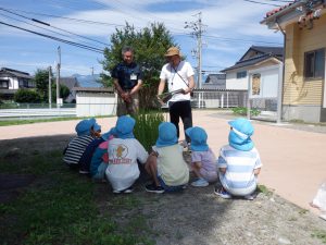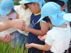 登降園の行き帰りの通り道にプチ田んぼがあるので、お家の方も一緒に見ていってくださいます。親子の会話に、園の田んぼのことが話題になってくれたら嬉しいです。