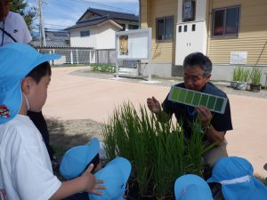 みんなの稲はどのくらい大きくなったかな?長さを図ってみます。子どもたちも興味津々。