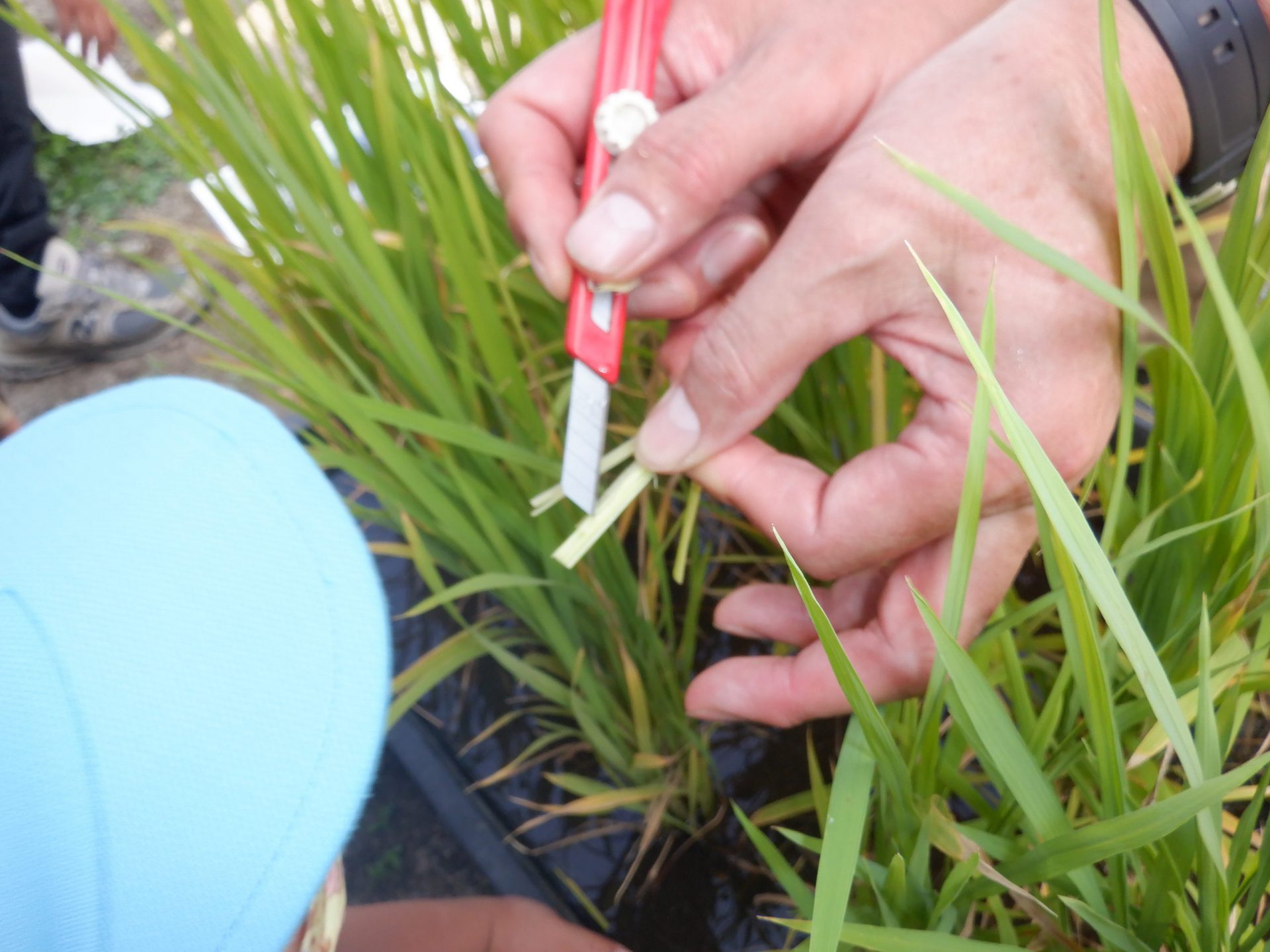 一本だけ切ってみて、お米の赤ちゃんが育っているか確認します。なんと!お米の赤ちゃんは根元にあるらしい・・・、じーっと見てみると、「あっ、ここにあるよ」「どこどこ?」