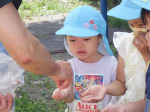 実は・・・少し前に年少さんのお友達が、お家の田んぼから”おたまじゃくし”を連れてきてくれて、田んぼに放してくれてあったのです。