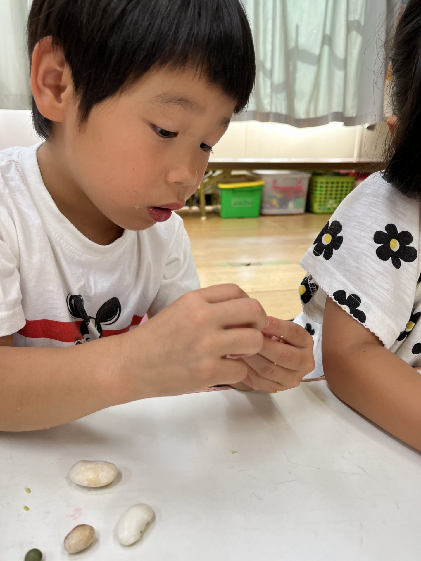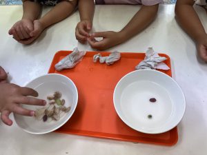 たった30分でしたが、白花豆の周りがモヤモヤと少し柔らくなっていました。これにはビックリ!子ども達の発想って凄い!「シワシワしてる」「豆にシワができた」「これ、剥けるんじゃない?」「大きくならなかったね」と。