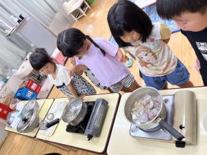 匂ってみる?と湯気を手で仰ぎながら匂いを嗅いでいました。「始めの時より匂いが凄くする」「匂い凄い!」「めっちゃする」煮る前との匂いの違いを感じていました。