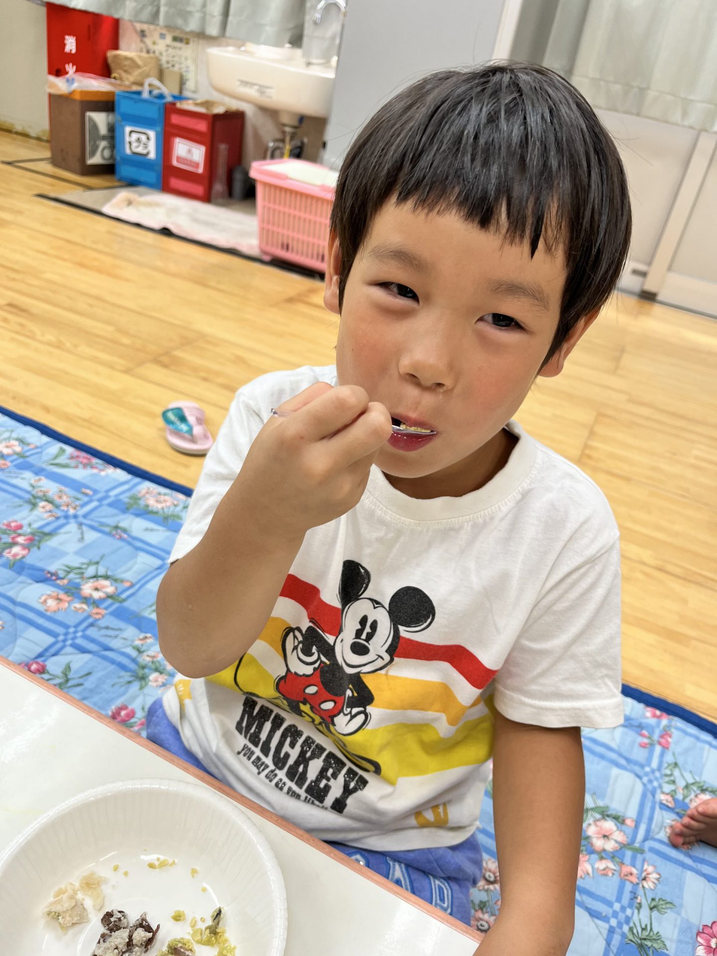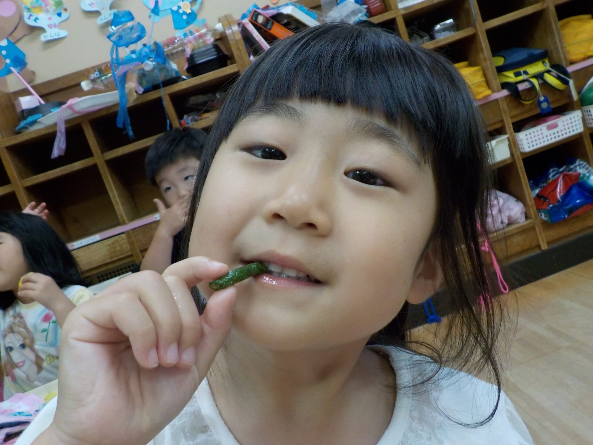 調理員が給食室で、紫花豆を甘辛煮に、三尺豆を素揚げにしてくれました。紫花豆は潰したので、「あんこは嫌いなの」とあんこと勘違いした子、味がついたことで「さっきのは不味かったけど、こっちは美味しい!」と“見た目あんこ”を頬張っているあんこ好きの子、と様々。素揚げは、塩が振ってあったのもあり「美味しい!」「おかわり」と大好評。自分達の三尺豆の生長と収穫が楽しみになったことでしょう。
