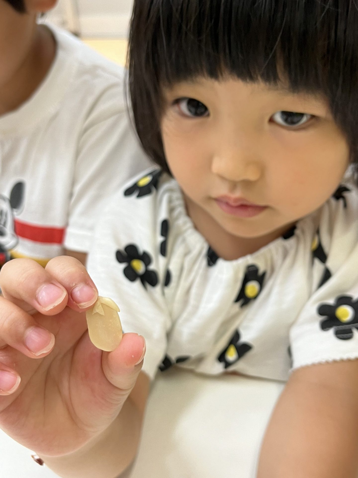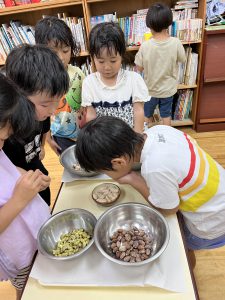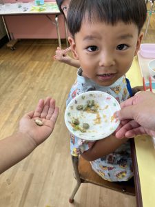 ・前回、目や手触り等で豆に触れ、絵本や図鑑で知識を得て・・・そうなったら「食べたくなるよね」と今回の試食会を企画しました。今、保育園では、豆を丸のままは食べることは出来ないので「味わえる方法はないか?」と調理員に相談したり栄養士や保護者に確認をとったりしながら開催することが出来ました。前回同様、子ども達の気付きや発見は大人が予想した以上にあり、子どもの感情は「美味しかったり美味しくなかったり」と正直な思いが発揮されて、味わうだけでなく子ども達にとっても楽しい会になったと表情から感じました。
