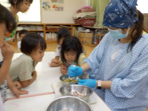 ふと、「何でお水につけておくの?」を思い出した年中さん。(先に、担任が水に浸しておく理由を話してくれてありました)