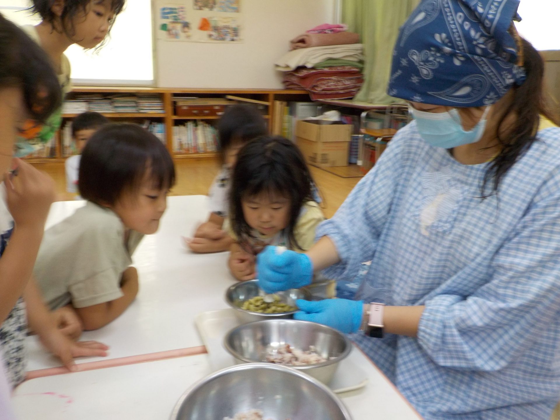 (保育園では豆を丸のまま食す事が出来ないので、潰すことにしました)