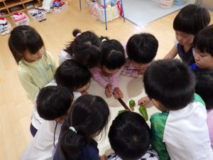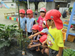 ・畑を園庭に作ったことで、興味、関心を寄せる姿になったように感じる。毎日、見に行けることで変化に気づけ野菜の世話の励みになっているように感じる。また、身近に畑に詳しい方がいて子どもと一緒に考えてくれることで活動の深みが増し、子どもたちの「もっと知りたい」「次、どうなるのかな」という好奇心の高まりや楽しみに繋がっているように感じる。