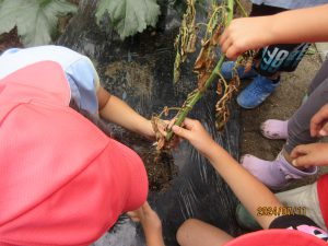 そこで、畑活動に携わってくれている保護者の方に聞いてみると「これは、青枯れ病という病気でなおらないんだよ。土にもうつっちゃうから消毒が必要なんだよ。」と教えてくれました。