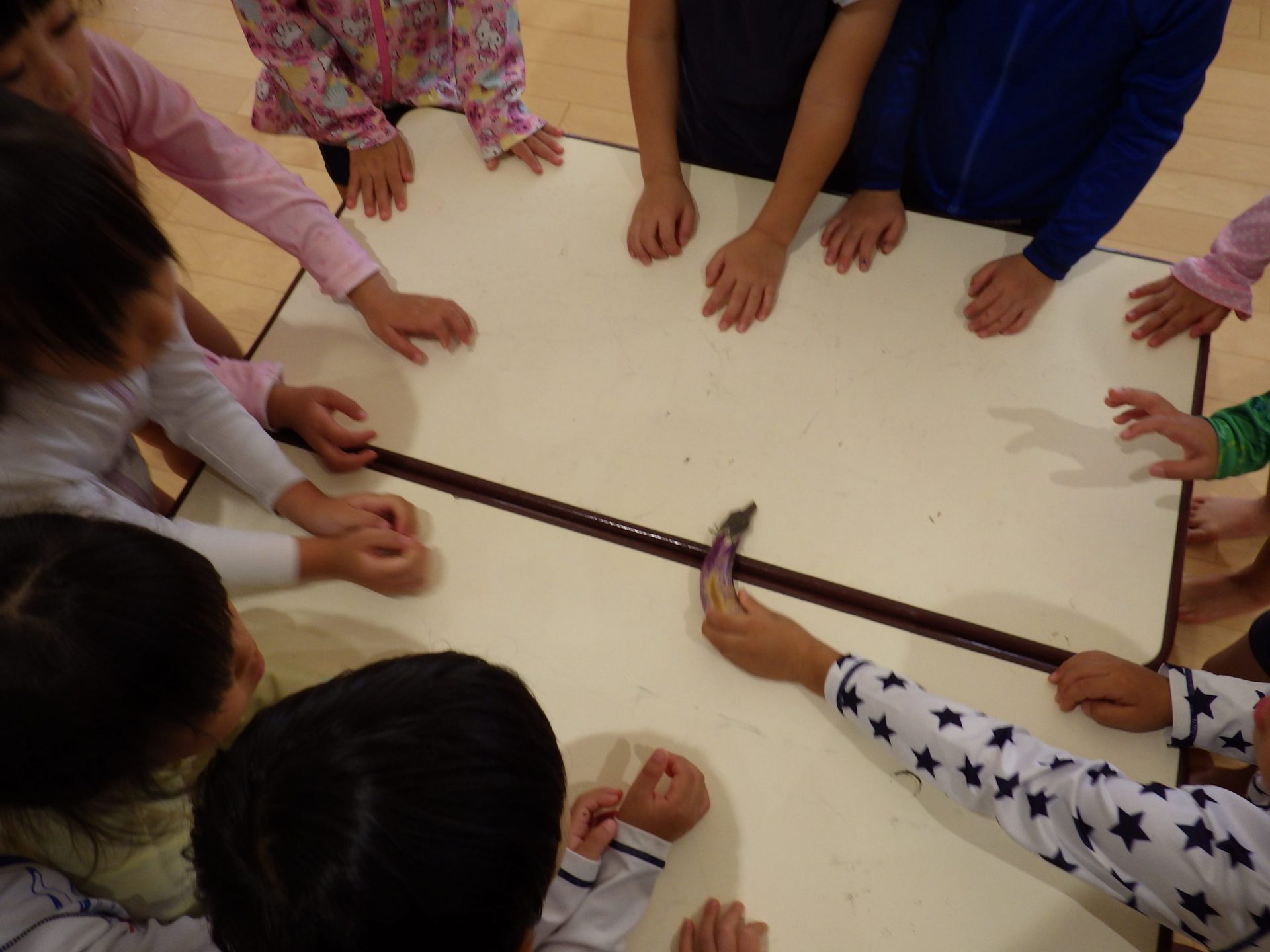 次にはナスの皮が茶色くなり、シワシワしてくると「また、畑の先生に聞いてみよう。」と興味津々の子どもたちです。