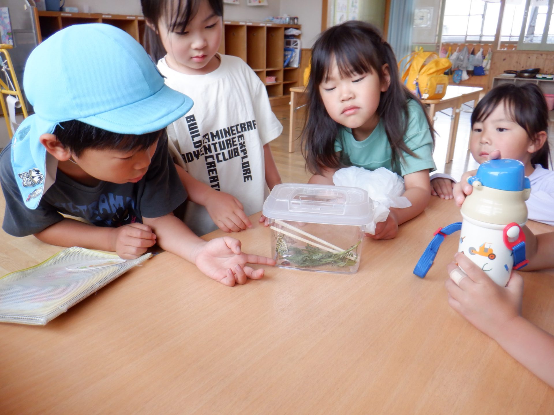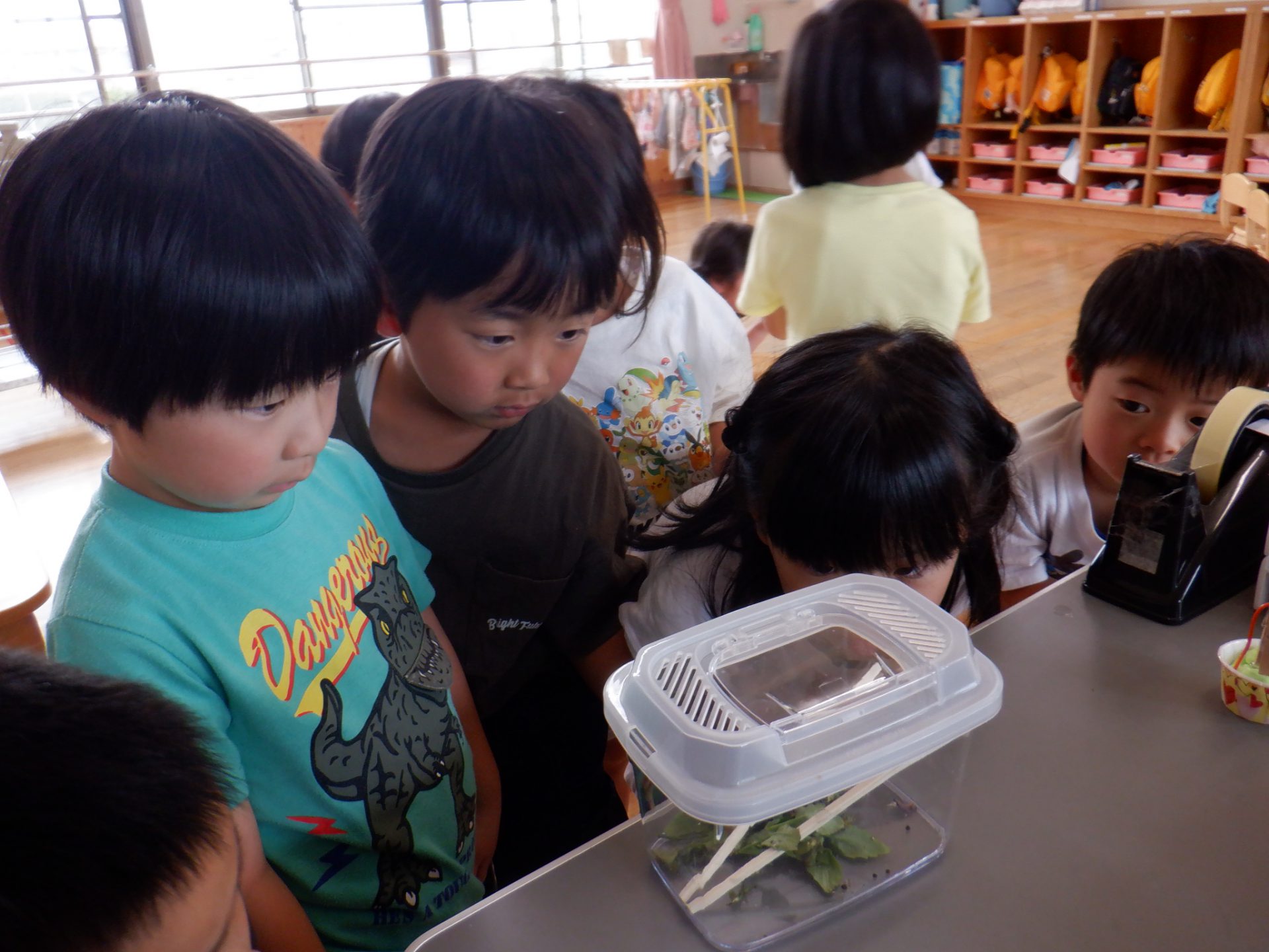 実物を見ることで、より興味や関心も深まり、大きさが変化すること、皮をぬぐこと、さなぎの色、形などを知り、成長していく中での変化をよく見ていました。