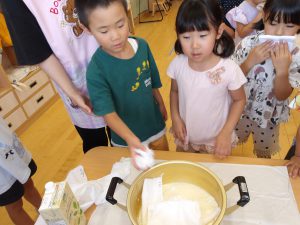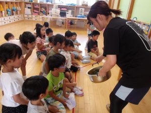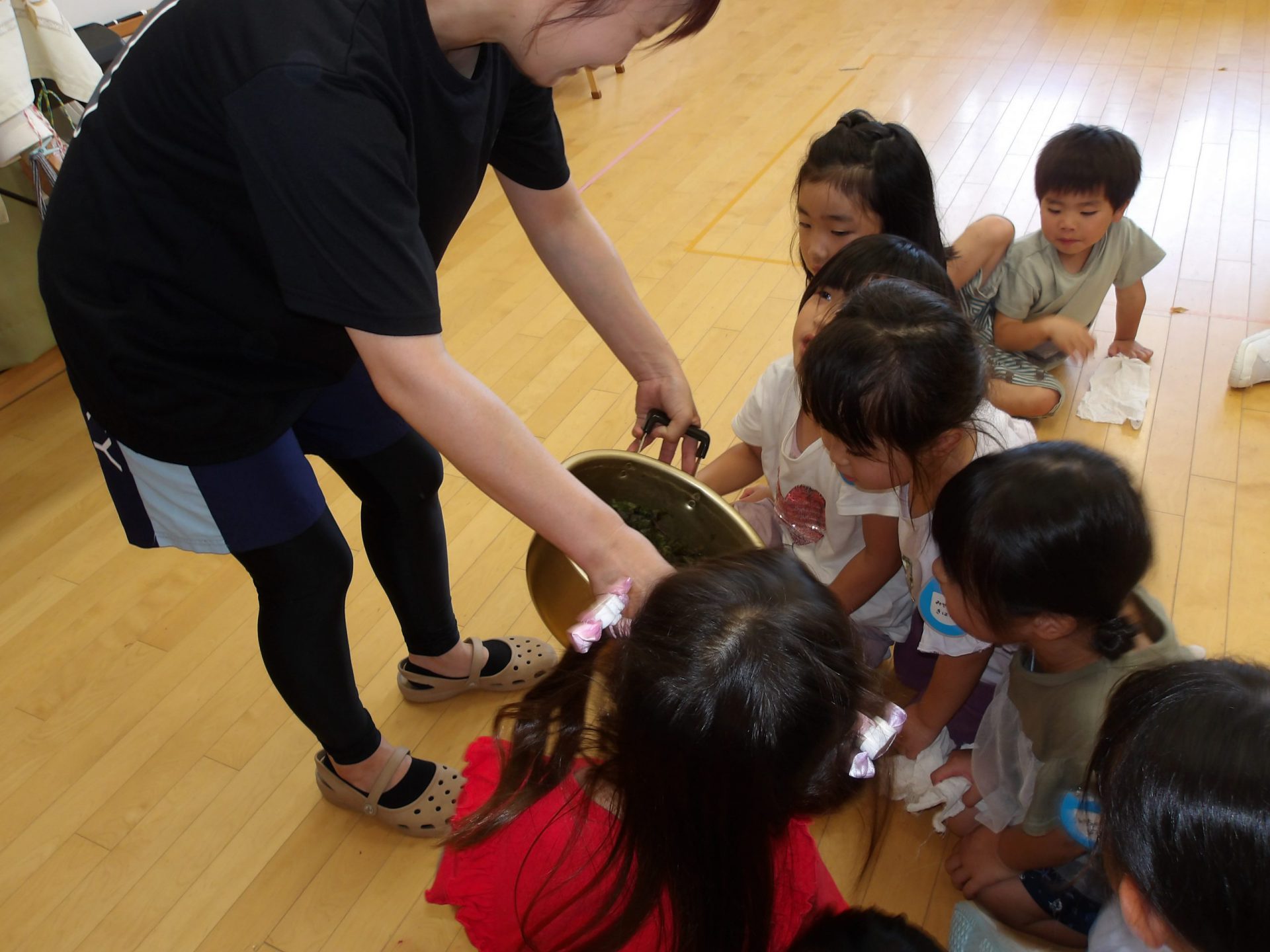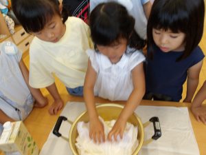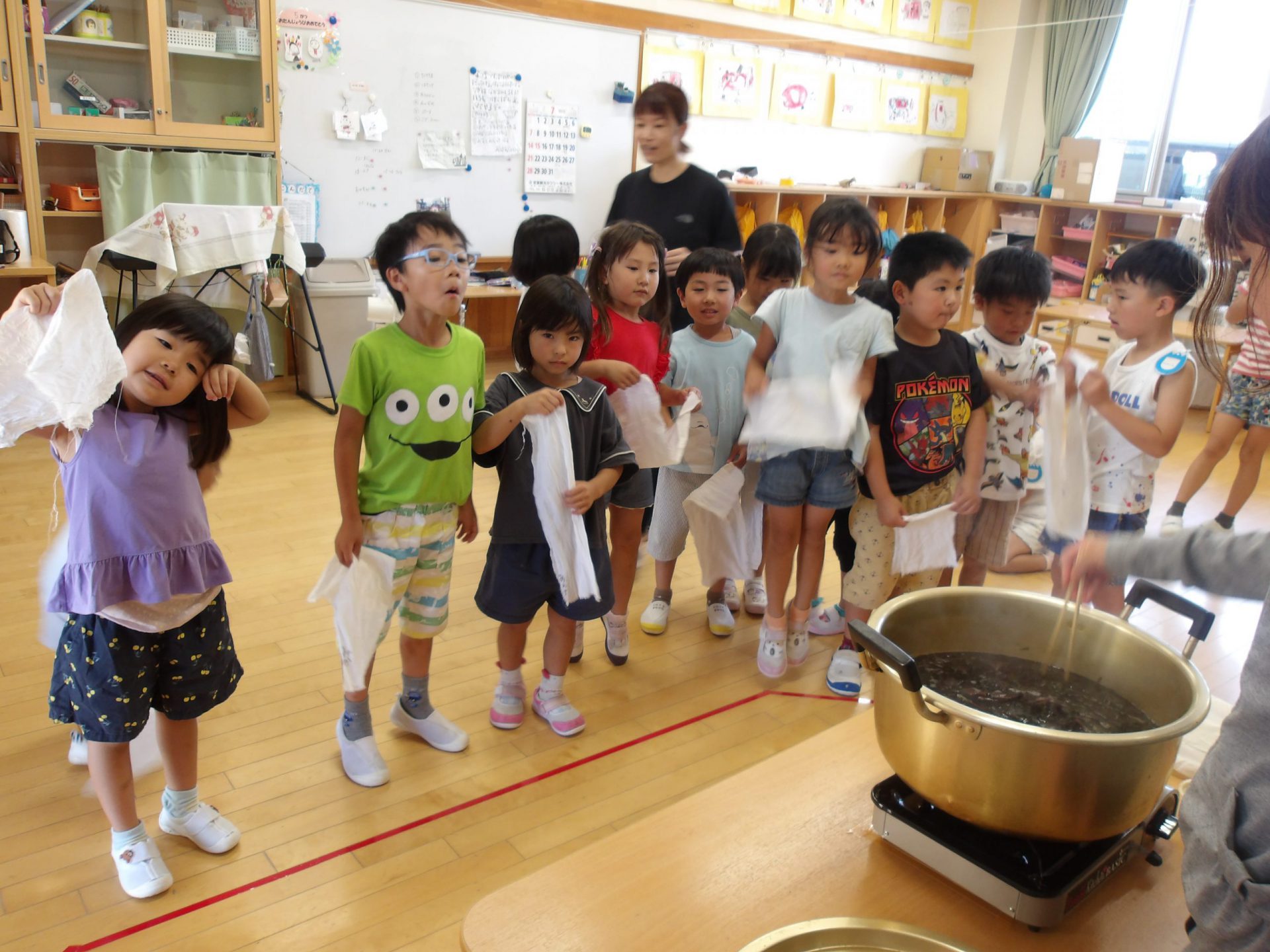 とっても綺麗な緑色になって、「あずき洗い〜!できたよー!」「見てくれるかな」と大満足の年長さんでした。