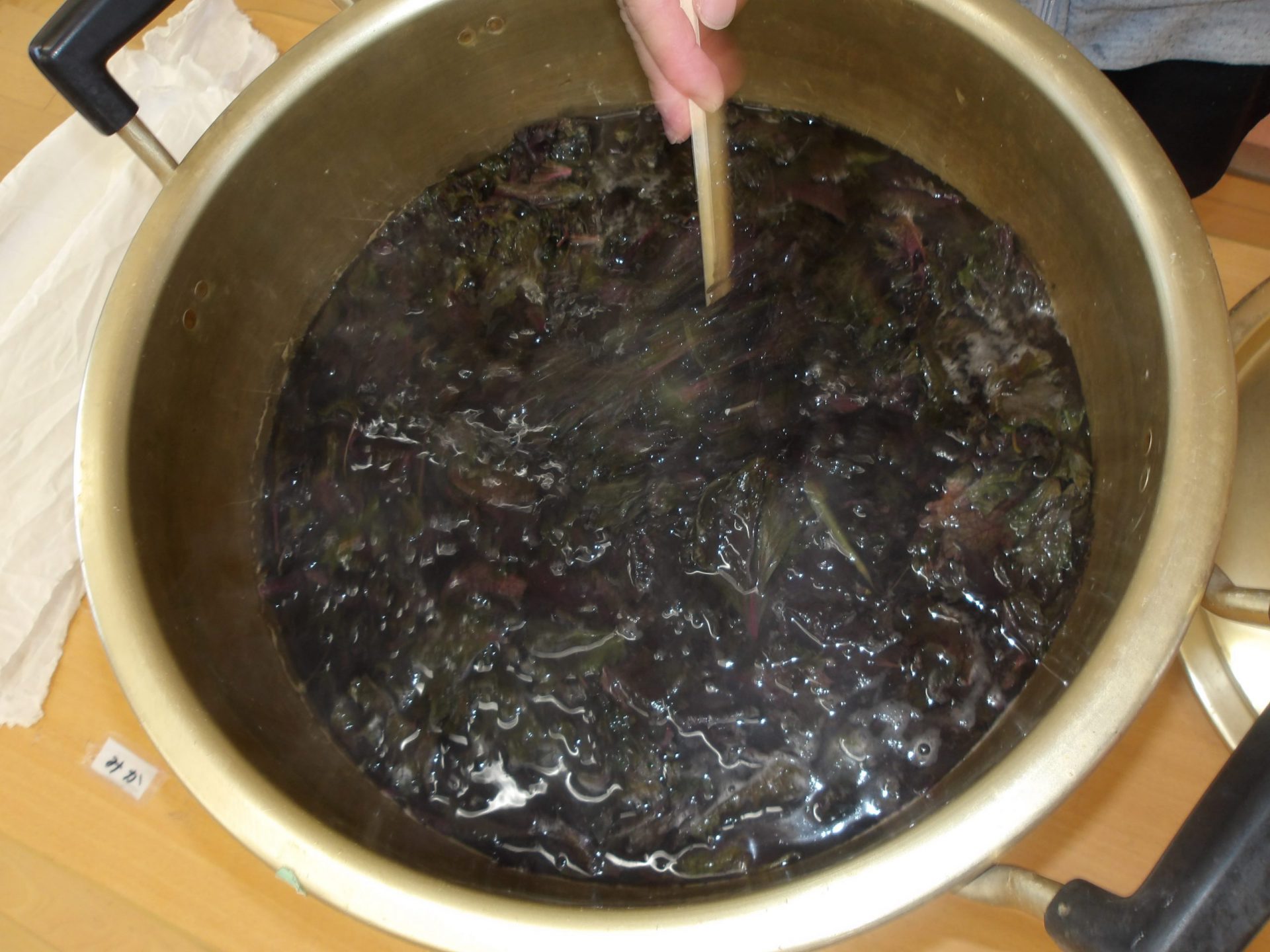 取り出した布と赤しそを、一緒にグツグツ煮込みます。