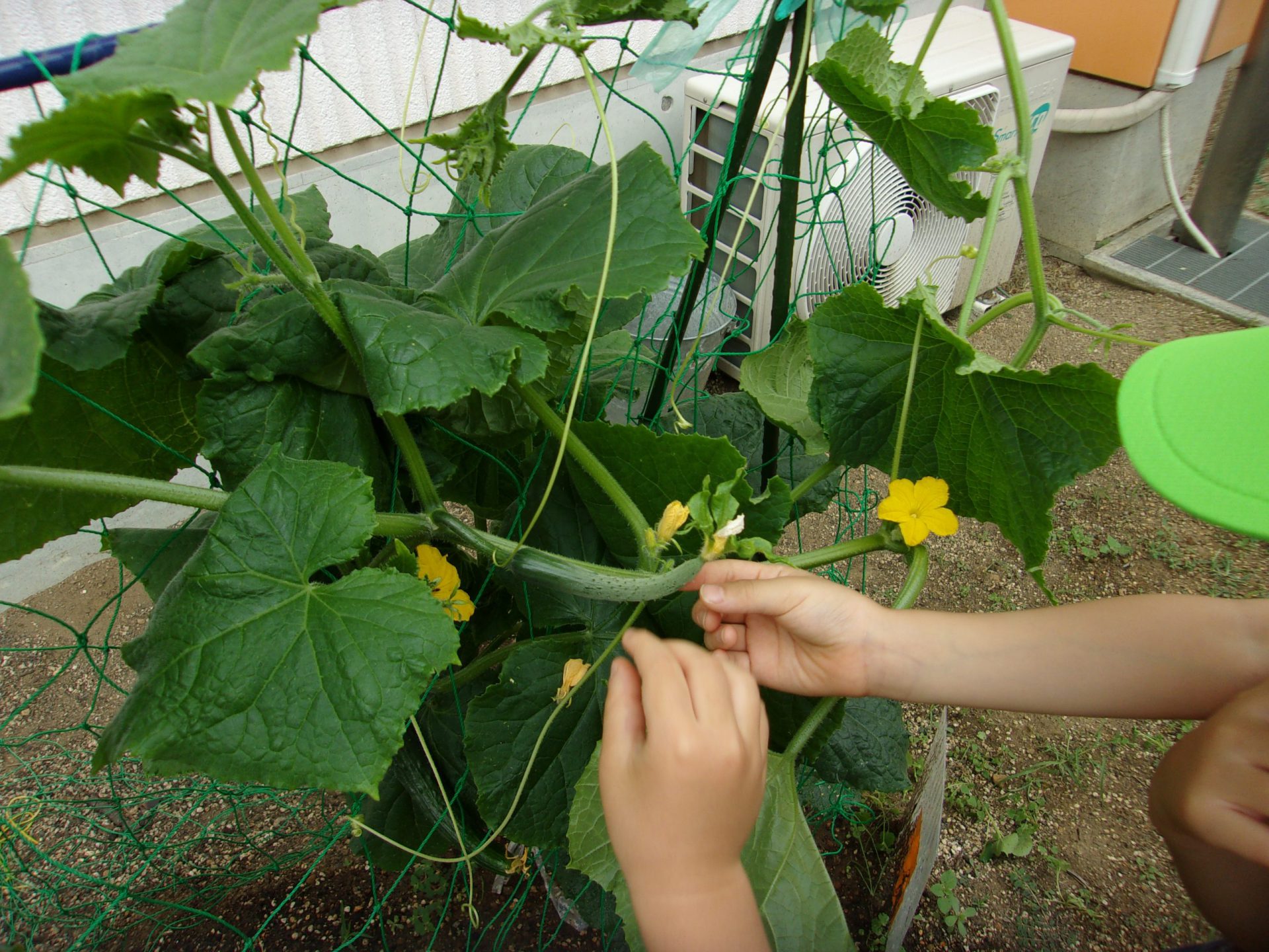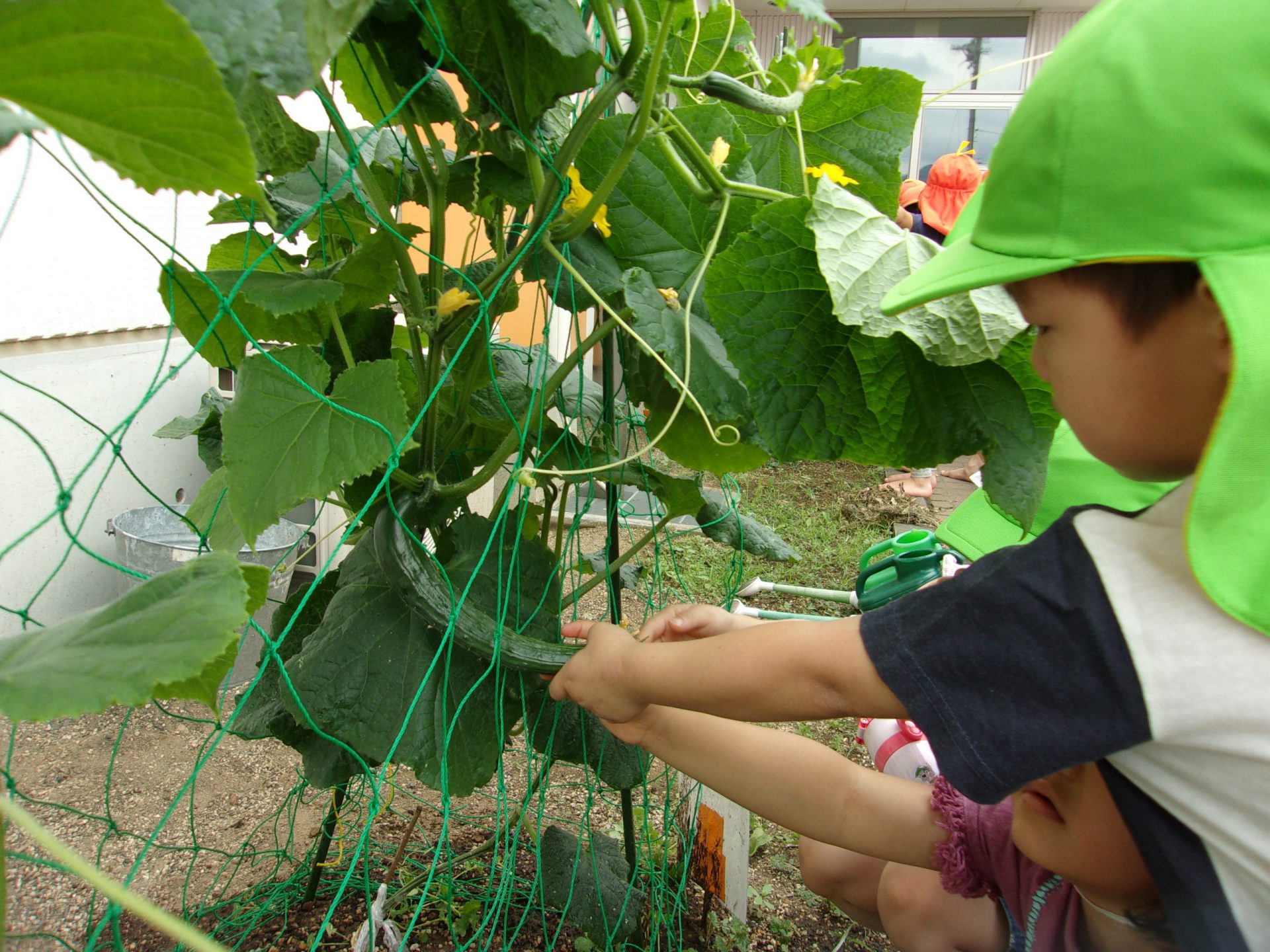 ・きゅうりが大好きな子どもたち。「きゅうりはどうやってできるのかな?」「土の中?」「木にできる?」子どもたちの疑問に、実際にきゅうりを育てて生長過程を知ることができるように栽培した。