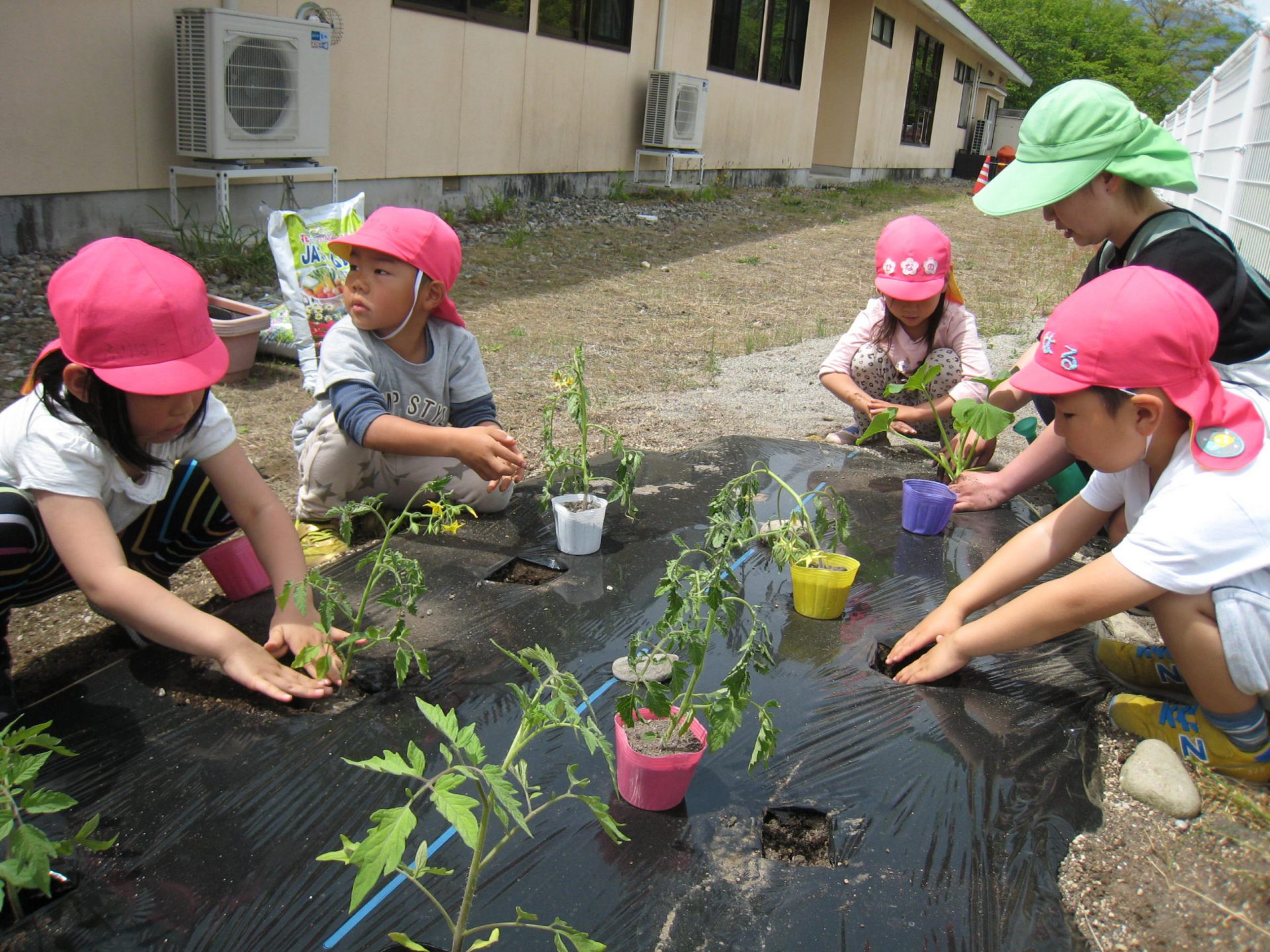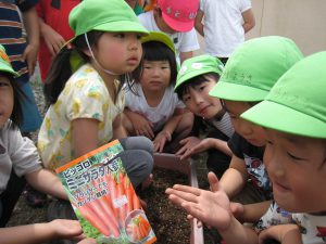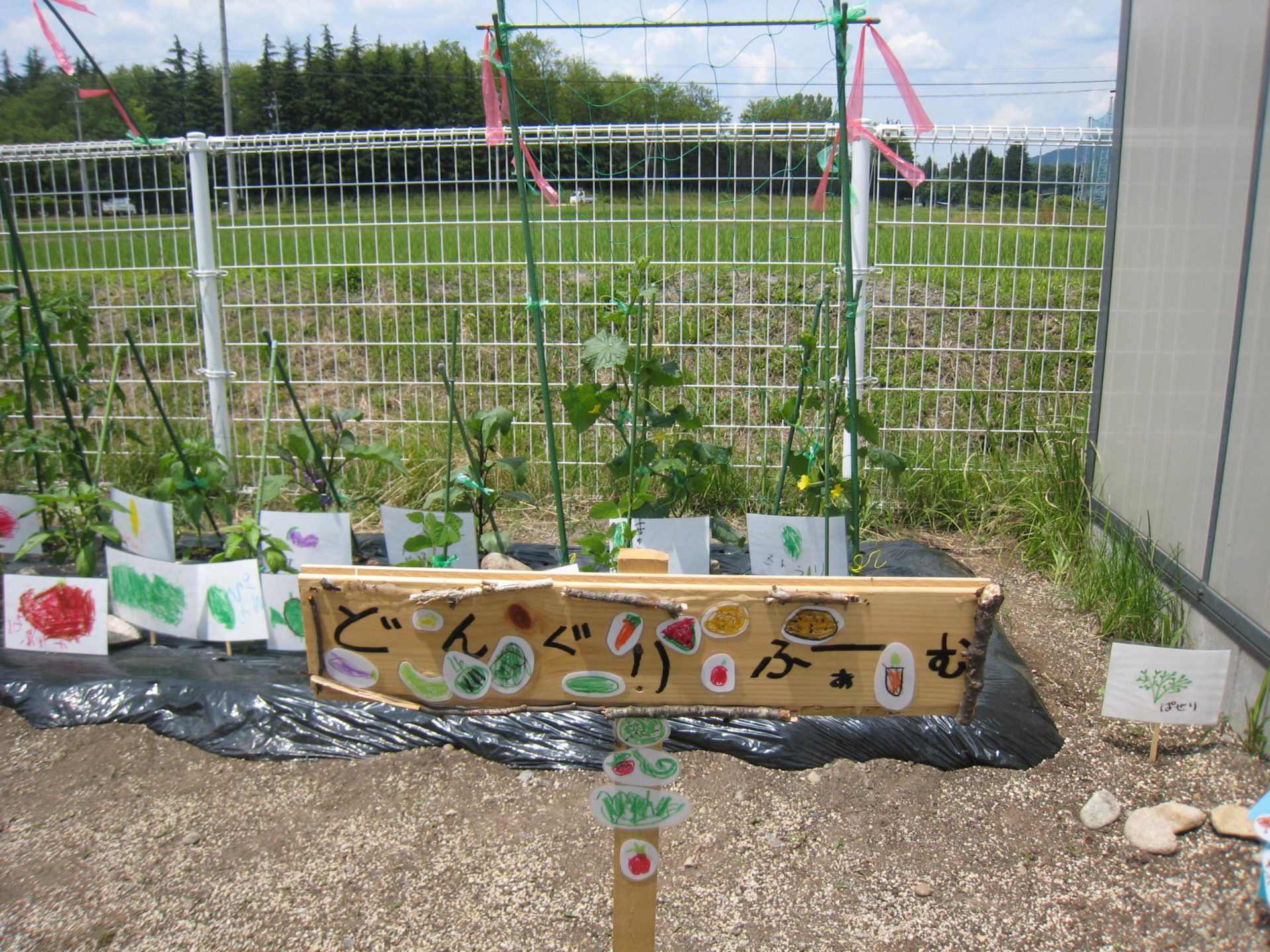 今年度、畑作りに挑戦することになりました。 きりん組(年長・年中)さんが中心になり野菜作りが始まりました。『何を作ろうか…?』 「きゅうり!」「すいか!」「めろん!」…。子どもたちからはたくさんの野菜の名前がでてきました。 畑で作る野菜が決定しました!! ★トマト ★ミニトマト ★かぼちゃ ★きゅうり ★ピーマン ★なす ★スナップエンドウ ★パプリカ ★はつかだいこん ★バジル ★にんじん ★すいか ★メロン 『さあ、苗を植えよう〜!』 『種をまこう!』 「おおきくなぁ〜れ!」 「おおきくなぁ〜れ!」おまじないも完璧!!