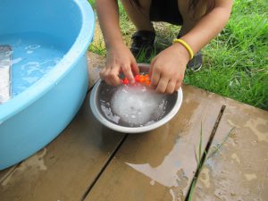 氷の中に入っている玩具を取り出そうと一生懸命な子どもたち。どうやったら溶けるかな??