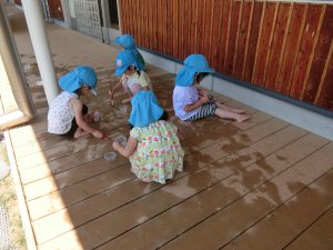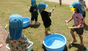 ・夏ならではの遊びを存分に楽しめるように環境設定をしました。水の感触や不思議さを感じながら、遊びを楽しんで欲しいです。