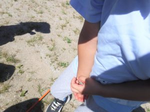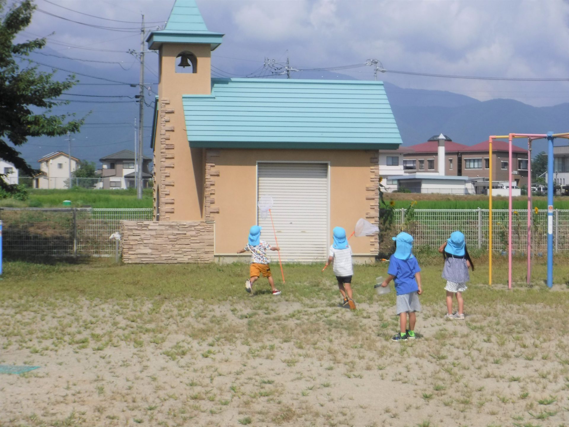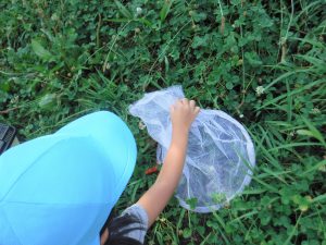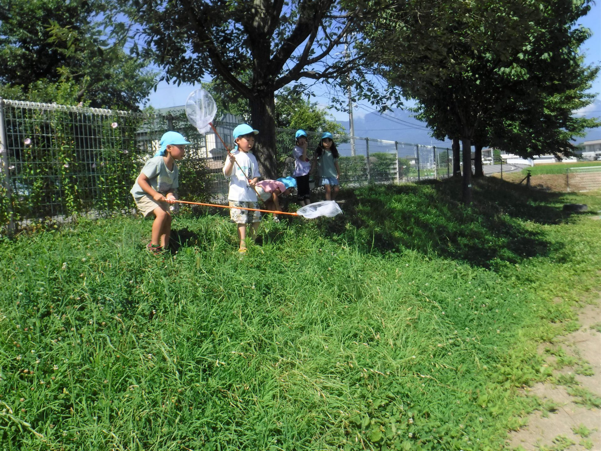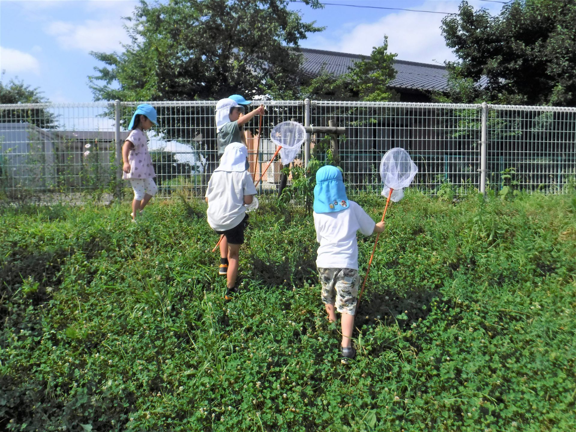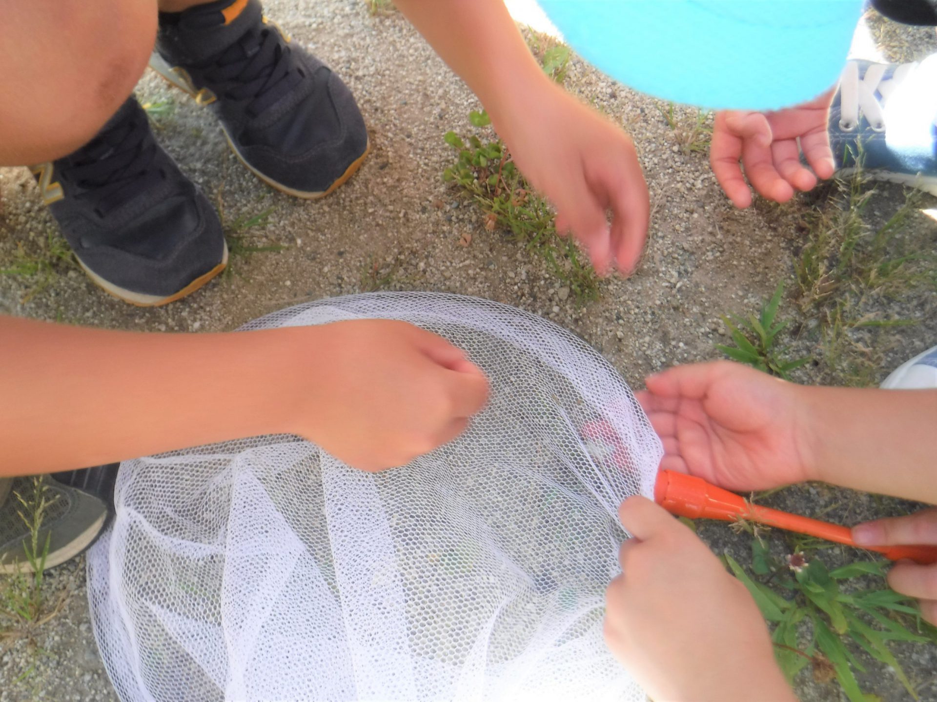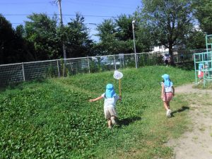 とんぼをつかまえたいと、あみを持ってあっちへこっちへ行くうちに、ひらひらと舞う小さい蝶や、子ども達の走りに草からとびはねるバッタに気づき、教え合ってつかまえることができました。