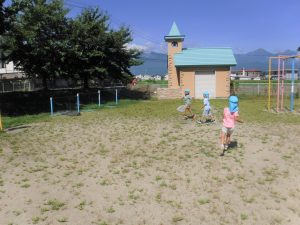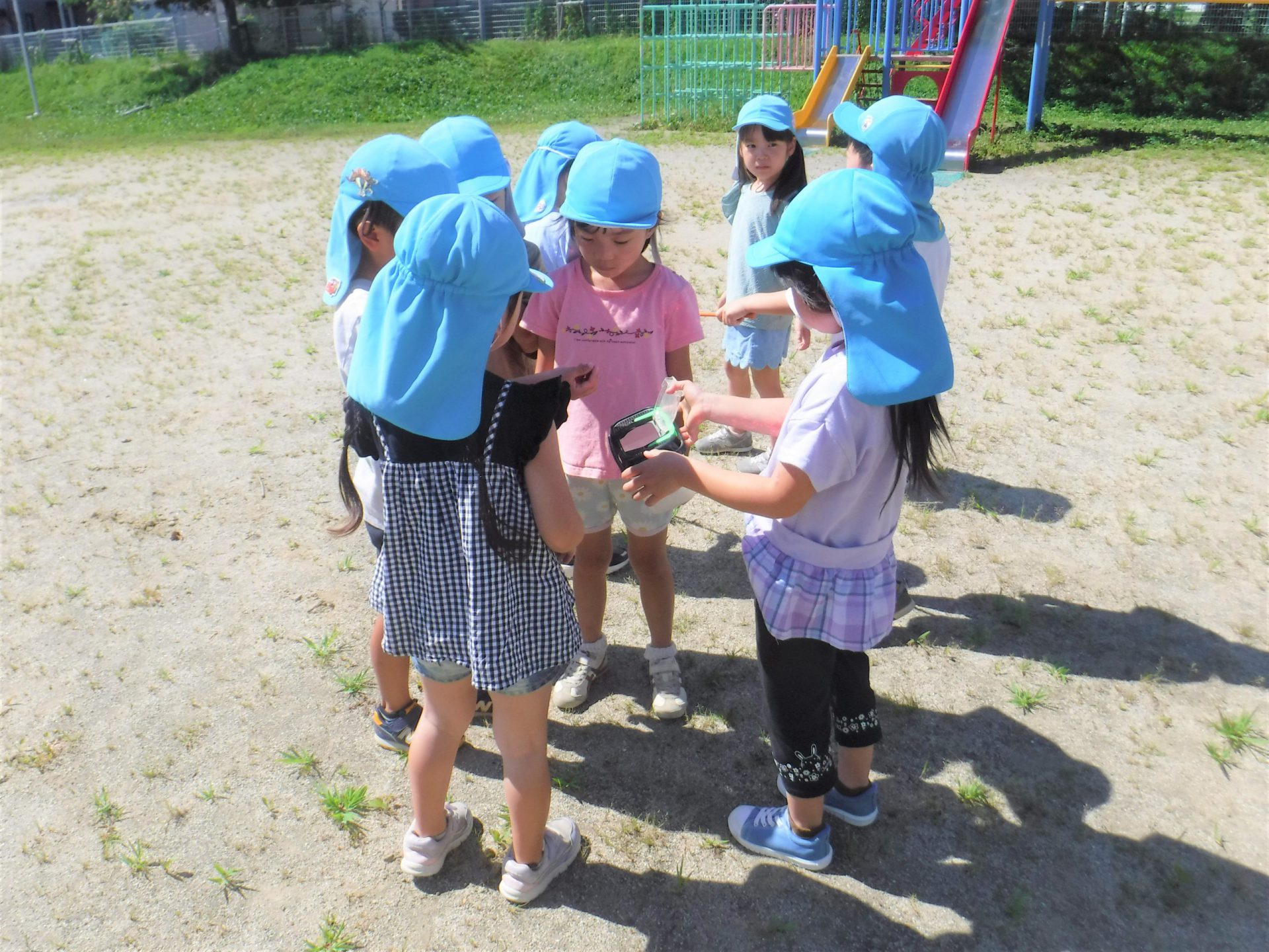 ・とんぼに気づき、すぐに虫とりあみが必要だと分かる年長さんに感心して見ていると、あみを持っていない子が虫の場所を教えたり、虫かごを持っていったり、つかまえた虫が逃げないよう、あみを押さえる子と虫かごのフタをあけて受ける子がいて、自然と友達と協力している姿に、さらに年長さんらしさを感じました。