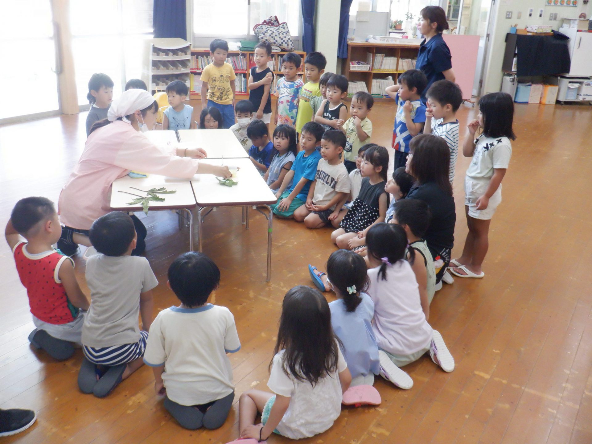 全員がホールに集まり、「オクラは給食で食べたことある!」と興味津々です。