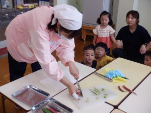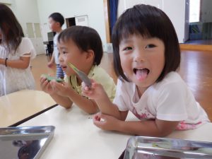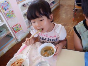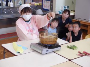 今日の給食のそうめん汁の中には園で収穫した野菜が入っています。